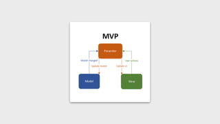 The document discusses challenges and responsibilities involved in Android app development since its launch in 2008, highlighting issues like callback hell and memory leaks. It examines various architectural patterns and the roles of different components such as Activities, AsyncTasks, and Services. The content emphasizes the importance of managing user interactions, data transformations, and updating the UI efficiently.