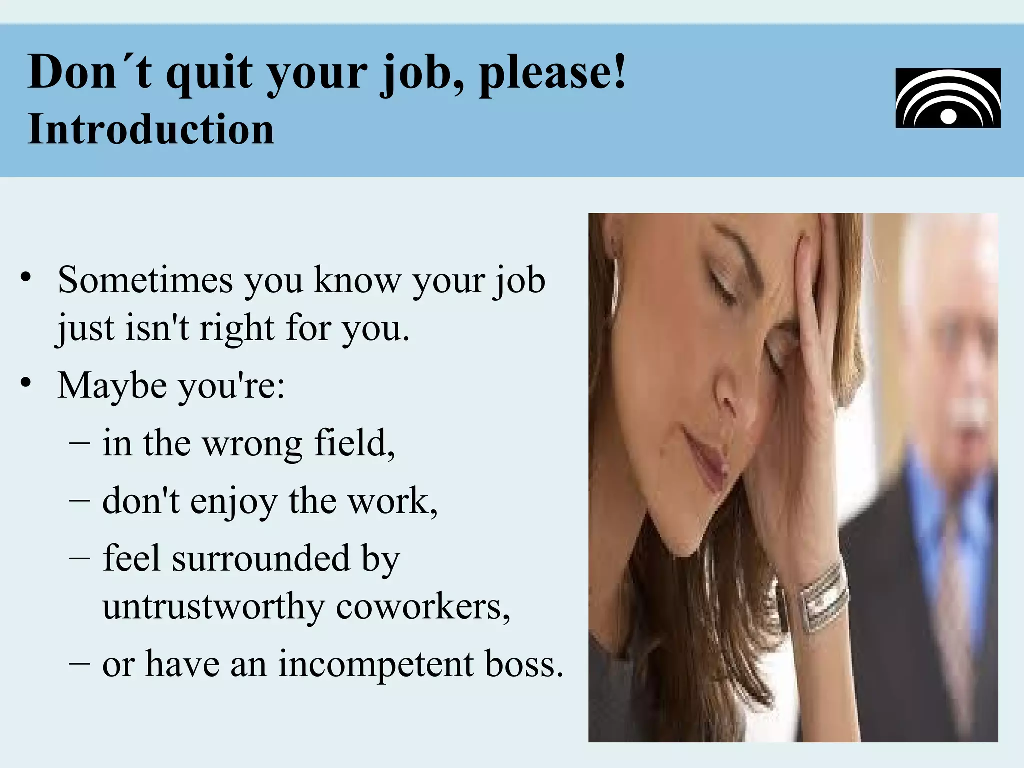 The document provides advice on not quitting your job. It discusses that while jobs may not be a perfect fit, quitting can have negative career and financial consequences. It recommends carefully analyzing dissatisfaction and offers tips to improve satisfaction like finding meaning in work, changing responsibilities or coworkers, and keeping options open rather than complaining. The main message is that quitting should be a last resort, and small changes may improve the situation instead of leaving the job.