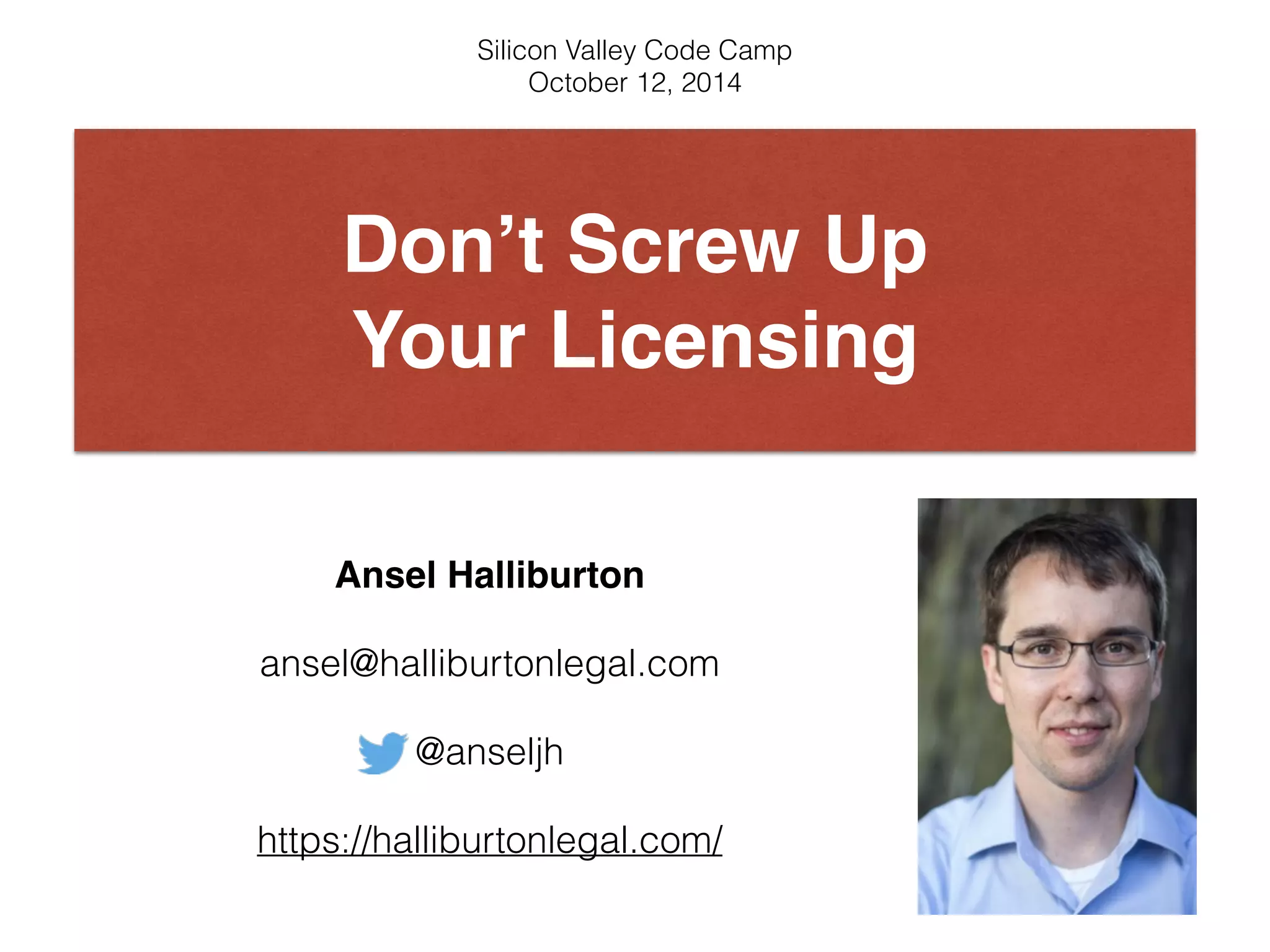 The document discusses how to properly license open source software to avoid legal issues. It recommends: 1) picking the right license for your project; 2) including attribution, license notices, and the full text of the license in your source code; and 3) using a contributor license agreement to assign copyrights of contributions to the project owner. Failure to follow proper licensing can result in losing control of your code, patents, trade secrets or even your company to legal issues. The presentation provides tips and examples of how to properly implement licensing.