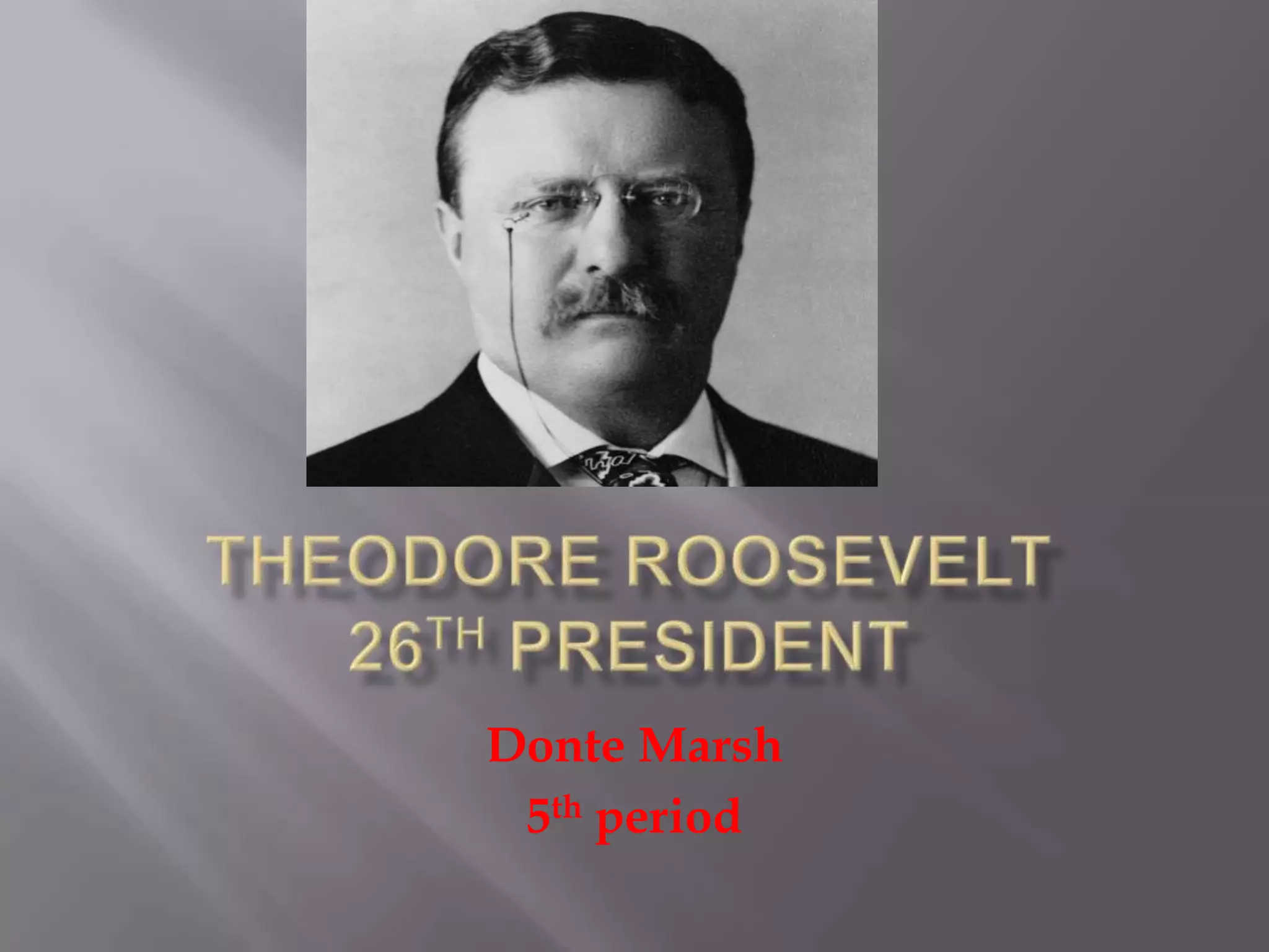 Theodore Roosevelt was born in New York and graduated from Harvard. He served in the New York state assembly and was a delegate to the Republican national convention. At age 42, Roosevelt became the 26th U.S. President following the assassination of William McKinley. As President, Roosevelt promised not to run for reelection and was the first American to win the Nobel Peace Prize. He was an active and respected President who helped the community.