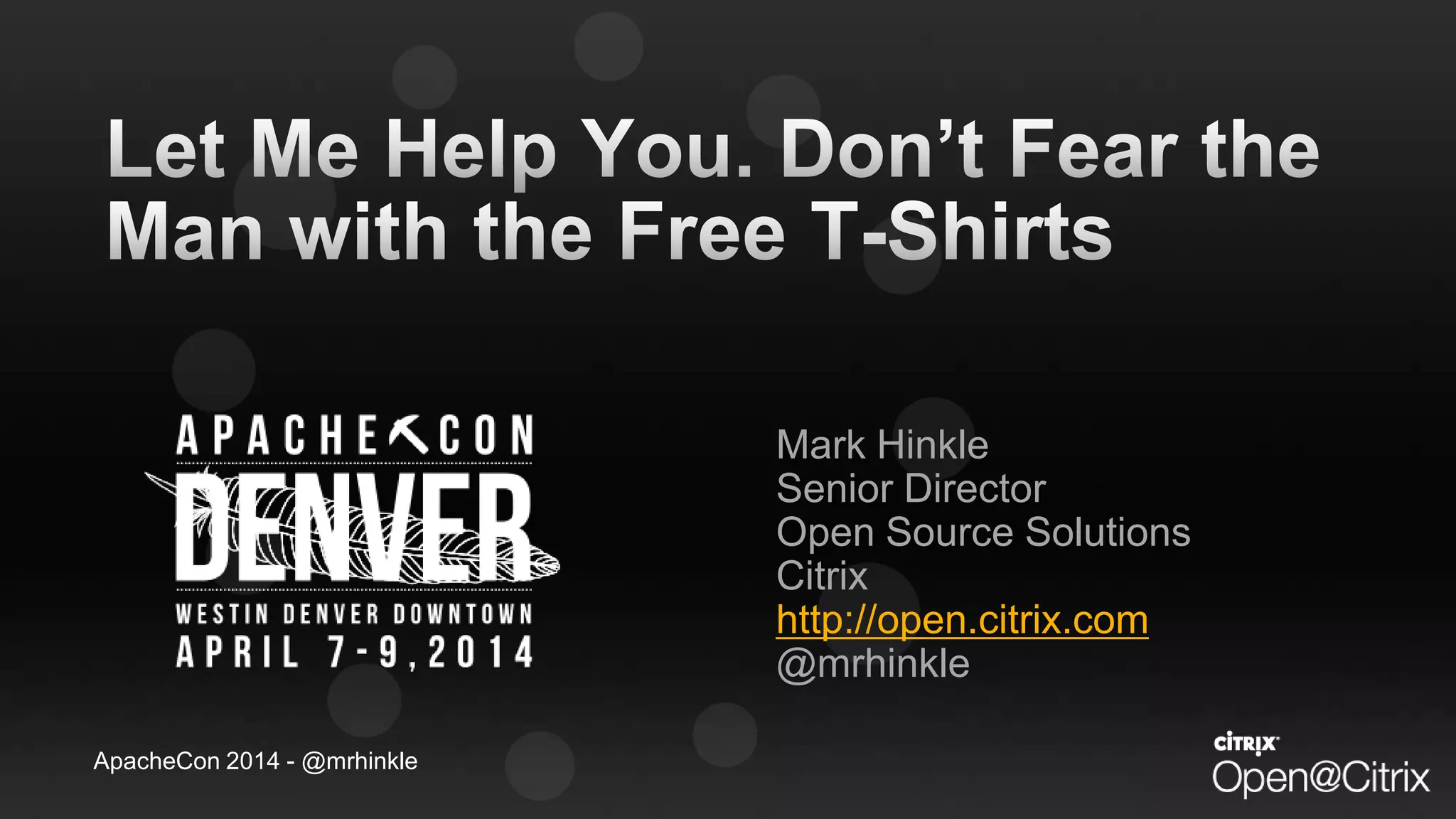 Mark Hinkle, Senior Director at Citrix, emphasizes the importance of open source software and community engagement in his speech at ApacheCon 2014. He discusses the need for better project promotion and user engagement within the Apache Software Foundation, as well as the value of collaboration in driving open source initiatives. The presentation highlights the challenges faced and the potential impact of robust support and resources for Apache projects.