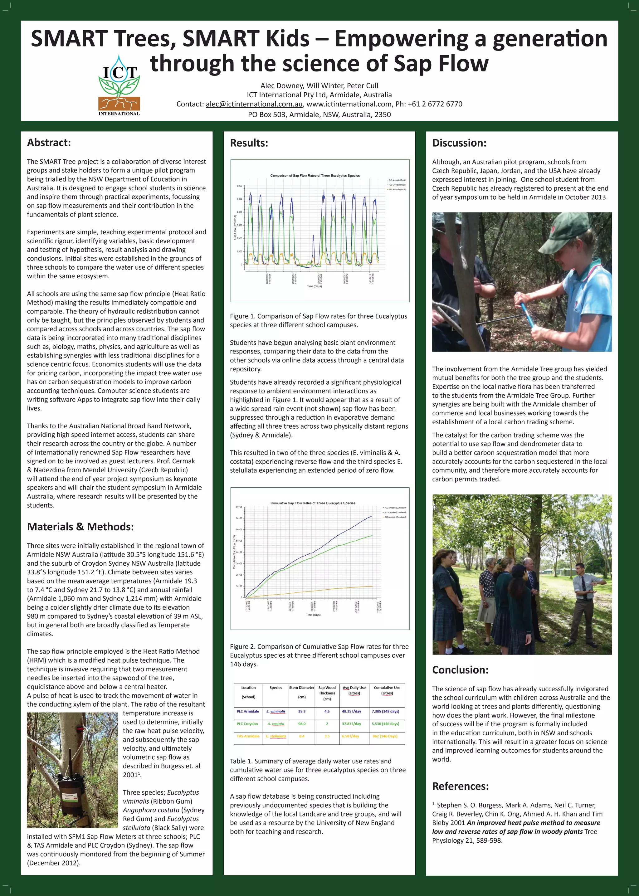 The SMART Tree project uses sap flow sensors installed on trees at multiple schools to engage students in hands-on plant science experiments. Students measure and compare water use of different tree species across different locations. Preliminary results show that rainfall events suppressed sap flow similarly in different species at different schools. The program aims to inspire students and improve science education by giving them experience with experimental design, data analysis, and sharing results internationally. It also benefits tree experts and the local community through development of a carbon trading program.
