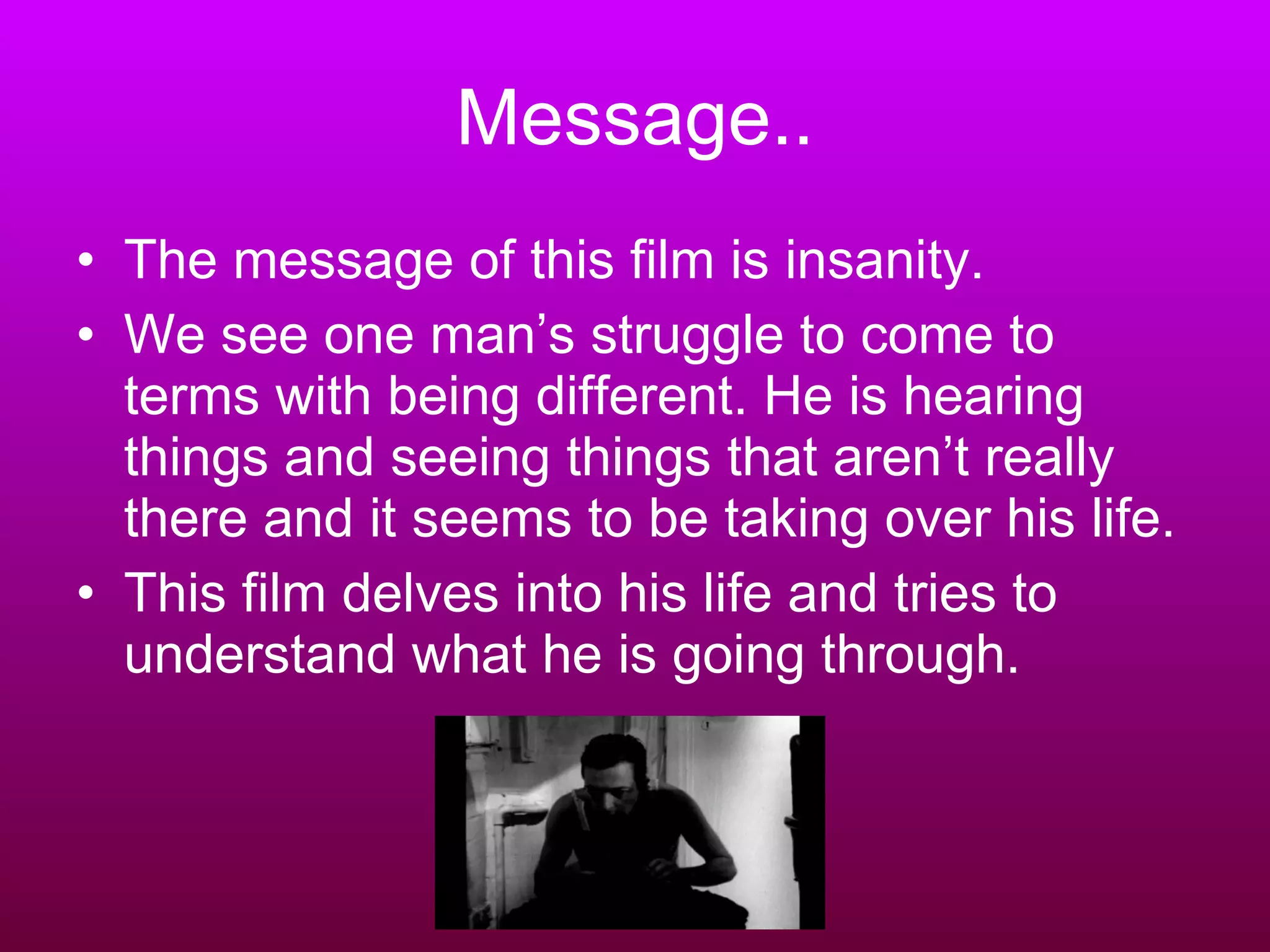 This film tells the story of one man's struggle with insanity through his disjointed perceptions of reality. The camera techniques, such as extreme close-ups and shifting perspectives, aim to illustrate his deteriorating mental state. There is no dialogue and the black and white cinematography and sparse setting reveal few identifying details about the main character. The slow pacing and smooth editing style present his insanity as normal to him, though disturbing to the viewer.
