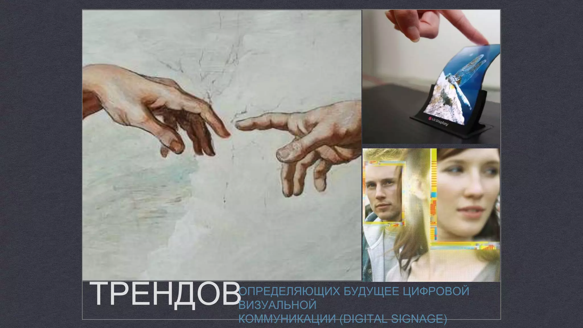 Документ описывает пять ключевых трендов в развитии цифровой визуальной коммуникации, включая создание искусственных 'собеседников' с интеллектом, лицами и глазом. Тренды включают использование органических дисплеев, развитие миникомпьютеров, системы визуального распознавания, ускорение интернета и искусственный интеллект. Ожидается, что к 2020 году такие 'собеседники' станут важным инструментом для навигации и информирования пользователей.