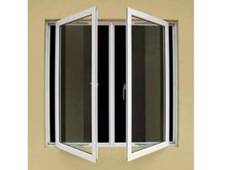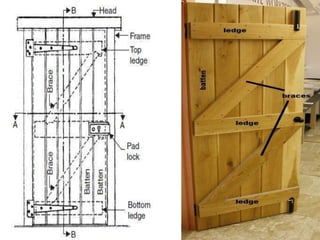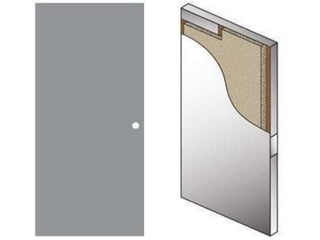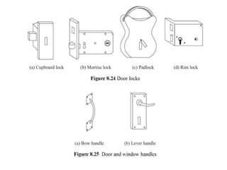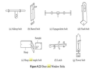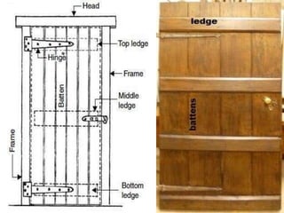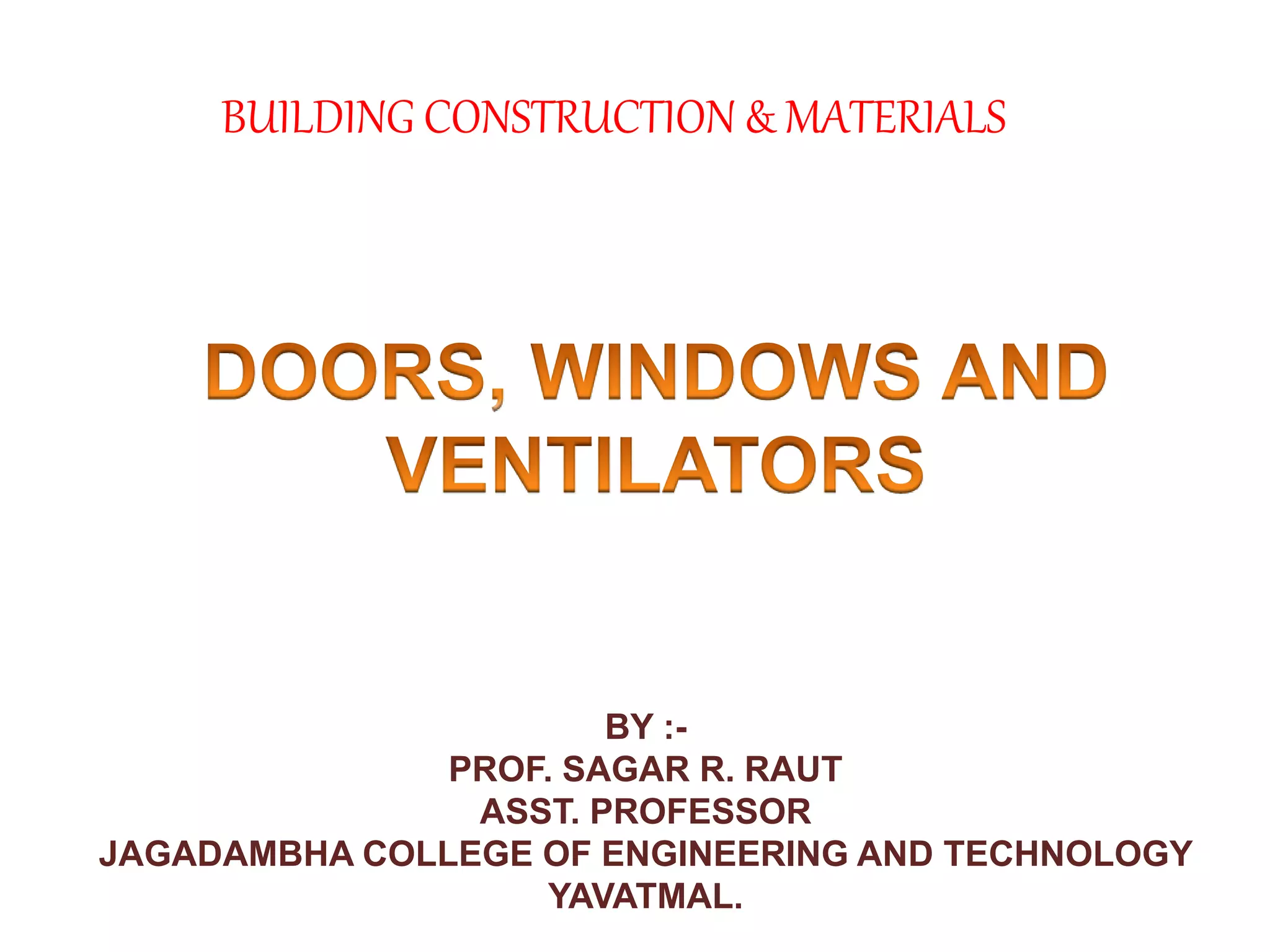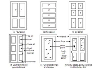 This document provides an overview of building construction materials with a focus on doors and windows. It discusses the definitions, components, sizes, types and selection criteria for doors and windows. For doors, it describes common types like framed doors, flush doors, and metal doors. For windows, it outlines fixed, sliding, pivoted, double hung and other types. Factors for selecting appropriate window types based on location, climate and other considerations are also summarized.