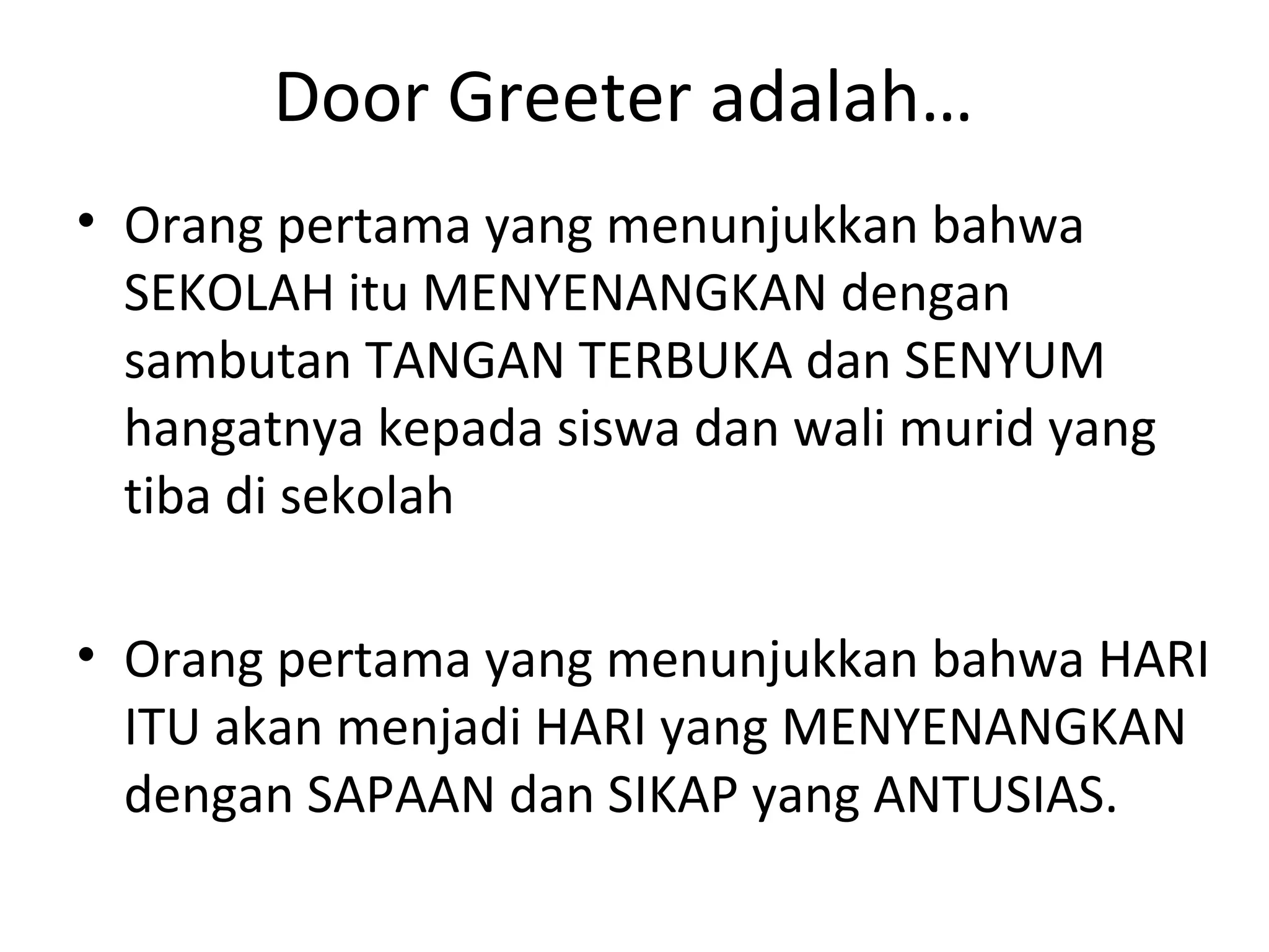 Door greeter adalah individu yang menyambut siswa dan wali murid dengan sikap ramah dan hangat saat tiba di sekolah. Mereka menciptakan suasana menyenangkan dan antusias untuk memulai hari. Peran ini penting untuk menciptakan kesan positif terhadap lingkungan sekolah.