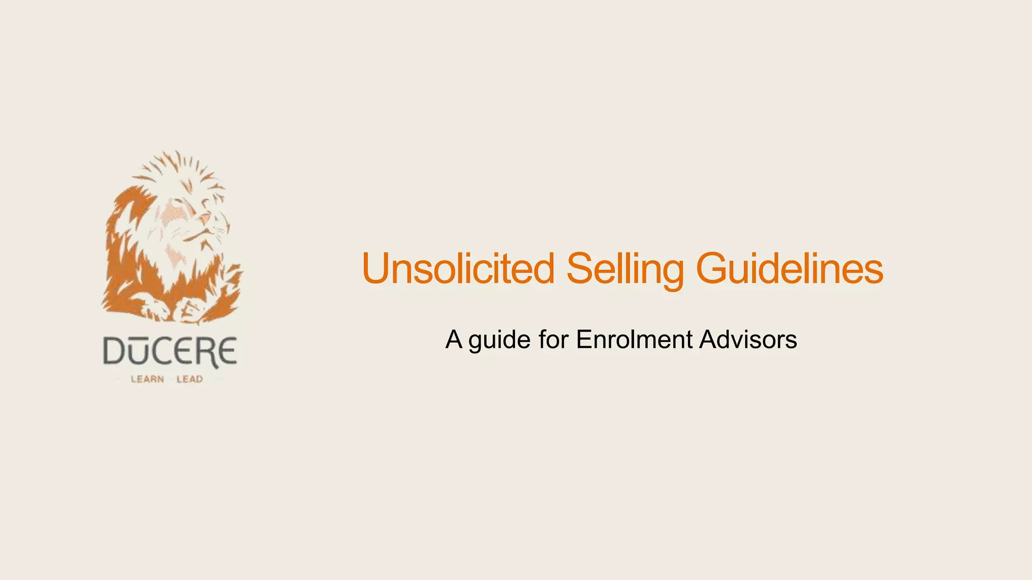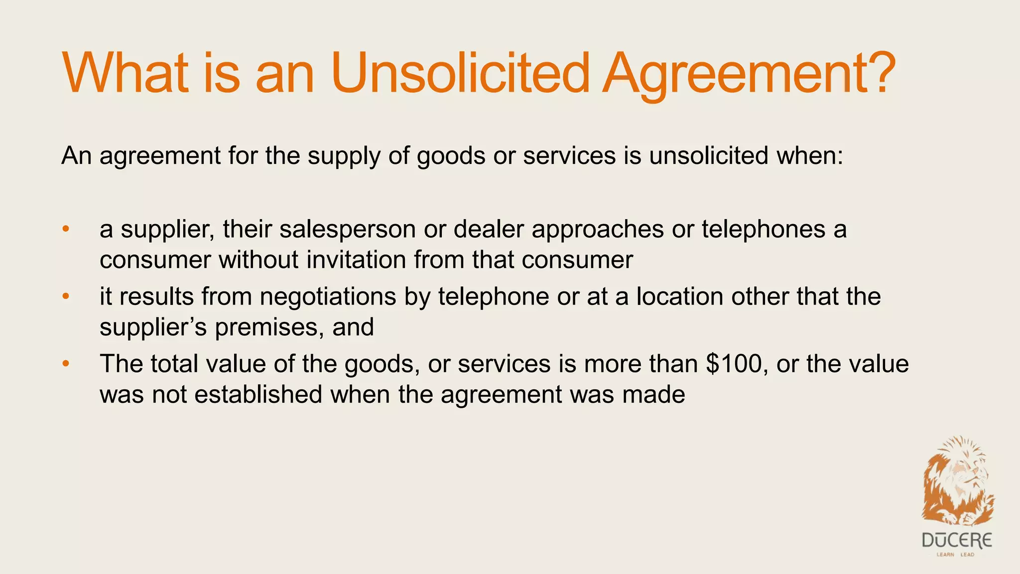 This document provides guidelines for salespeople regarding unsolicited sales agreements. It outlines that an unsolicited agreement is one where a supplier approaches a consumer without invitation for goods or services over $100. Contact hours for salespeople are between 9am-6pm on weekdays and 9am-5pm on Saturdays, unless a prior appointment has been made. Salespeople must disclose their identity and organization, and leave if asked. Written agreements must inform consumers of their termination rights, be signed by both parties, and provide transparent terms in plain language. Sales contracts must clearly state pricing, supplier details, and consumer rights. An implied license allows entry to public property but is void if a do not knock sign is