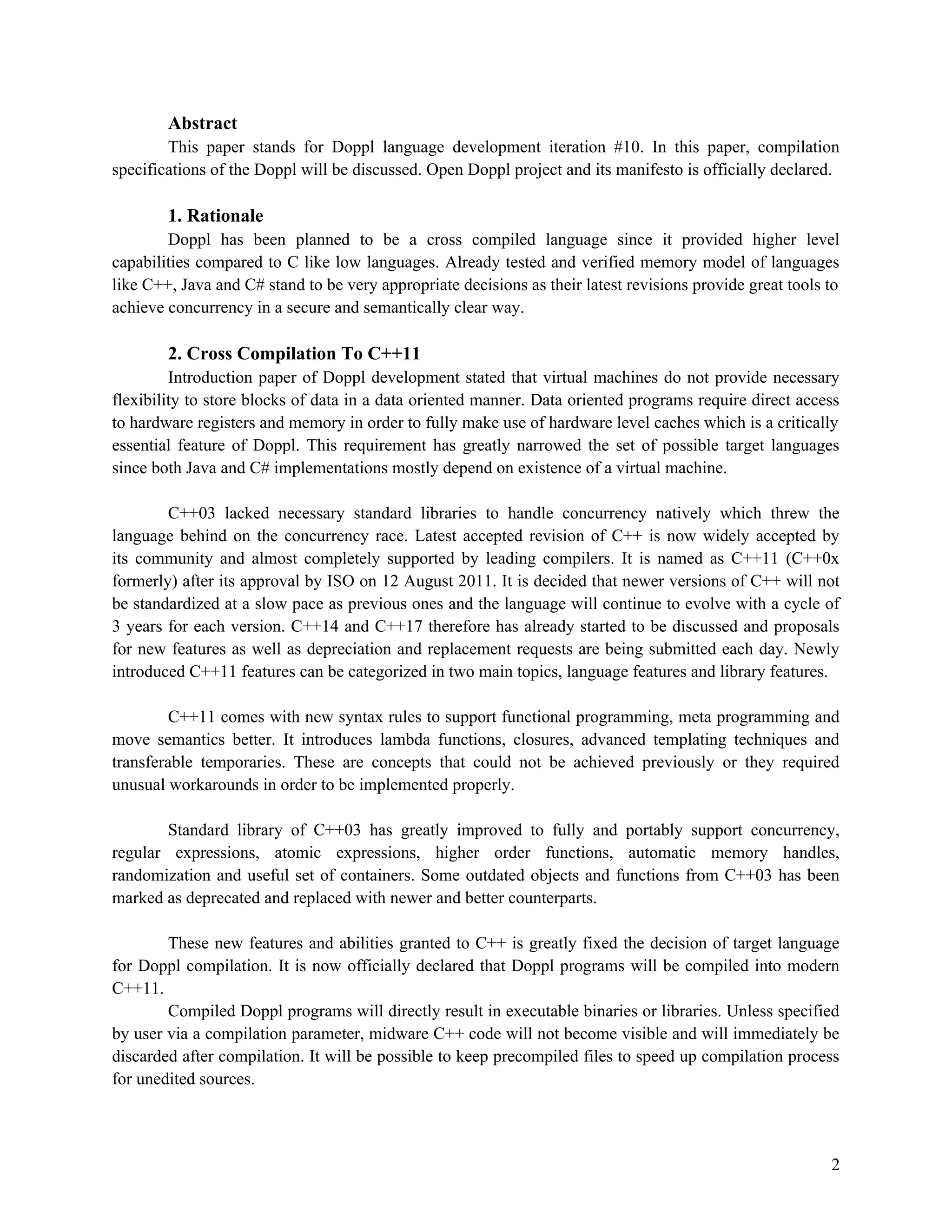 This document outlines the tenth iteration of the doppl programming language's development, focusing on its decision to compile into modern C++11 due to its improved features for concurrency and data-oriented programming. The project is declared open-source with a commitment to transparency and community involvement in its evolution. Future iterations plan to introduce various new programming concepts and maintain a commercial use provision without legal restrictions.
