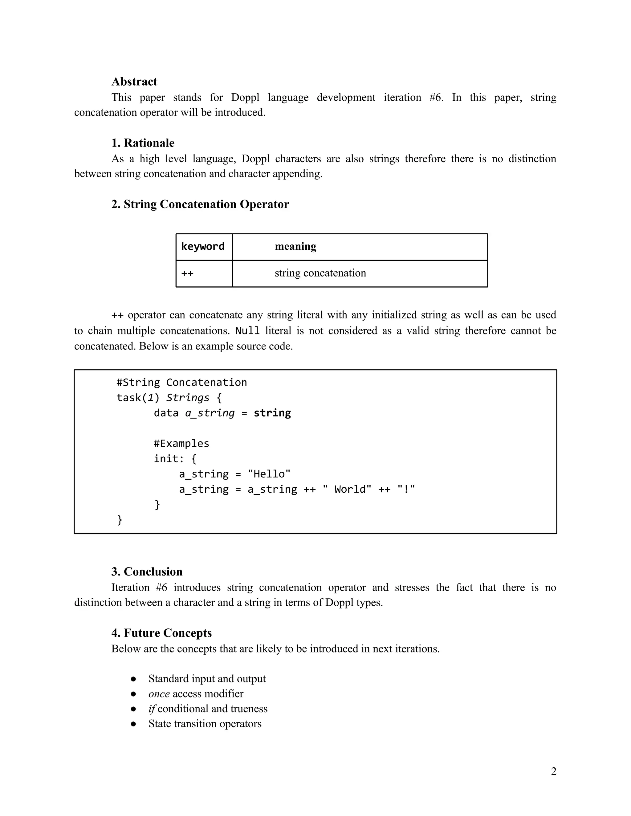 This document details iteration #6 of the doppl programming language development, focusing on the introduction of the string concatenation operator, which allows for concatenating literal strings and initialized strings. It emphasizes that in doppl, characters are treated as strings, with no distinction made between them. Future iterations are suggested to introduce additional functionalities, including standard input/output and various operators.