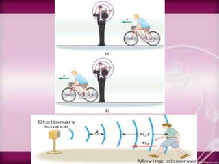 The Doppler effect is an apparent change in frequency or wavelength of a wave caused by relative motion between the source and observer. The document discusses the Doppler effect as it relates to sound waves and light waves, explaining that a moving source toward the observer results in a higher frequency (blueshift), while a moving source away results in a lower frequency (redshift). It also discusses cosmological redshift caused by the expansion of the universe.