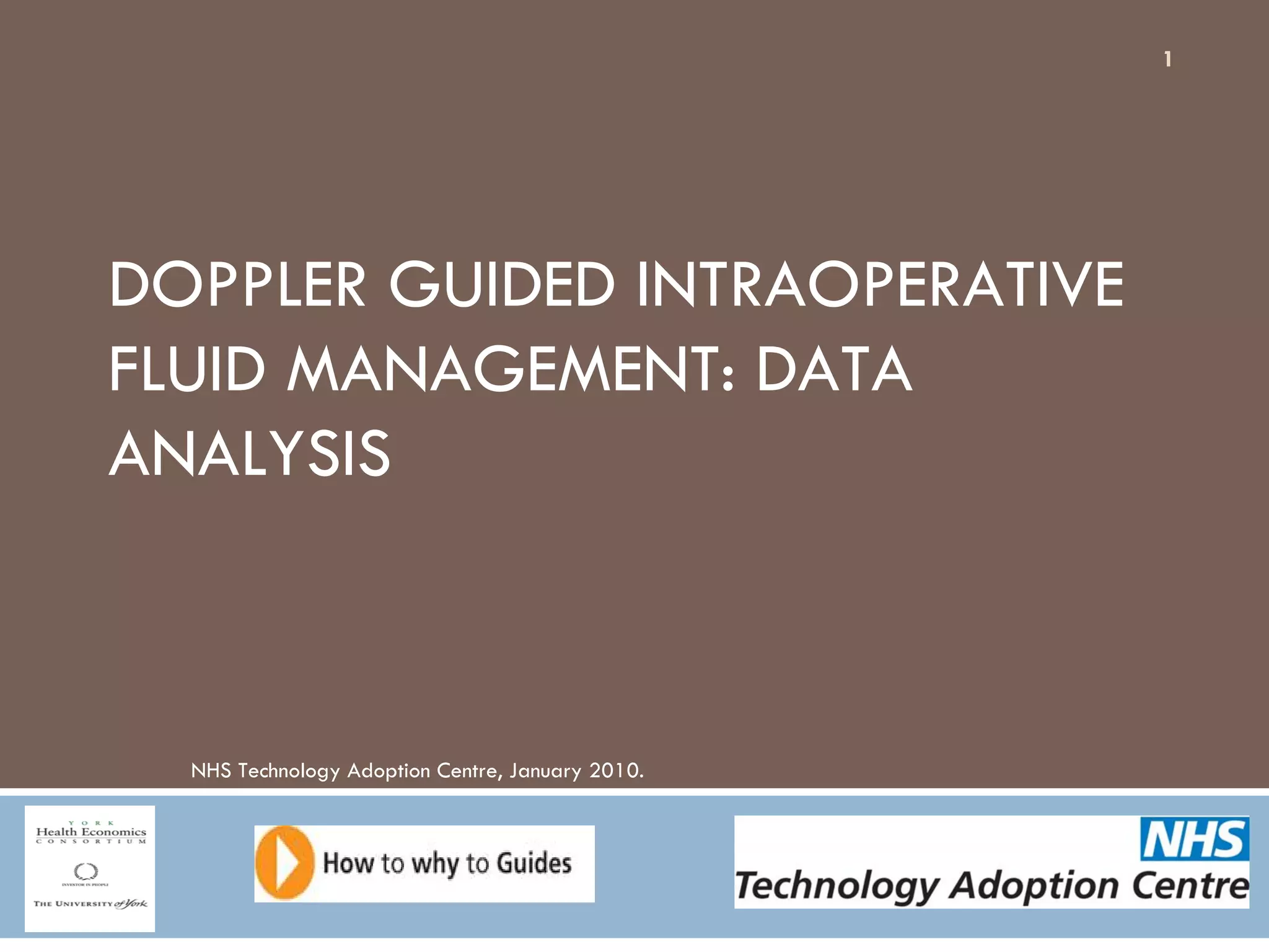 This document analyzes data from a study comparing Doppler guided intraoperative fluid management (intervention) to standard care (control) in surgical patients. Key findings include: a 67% decrease in operative mortality rate, reductions of 3 days in length of stay and 4 days in post-operative length of stay, and decreases of 23% in central venous catheter insertion rates, 33% in re-admission rates, and 25% in re-operation rates with the intervention. Length of stay in the highest level of critical care was reduced by 11 days.