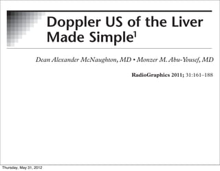 The document discusses Doppler ultrasound of the liver. It aims to describe the technical parameters useful for obtaining a diagnostic study, the normal characteristics of hepatic vessels, and some pathologies where Doppler US is useful. It covers Doppler techniques, anatomy and physiology, and pathology. It discusses optimizing Doppler parameters like pulse repetition frequency and baseline to improve image quality and avoid aliasing artifacts.