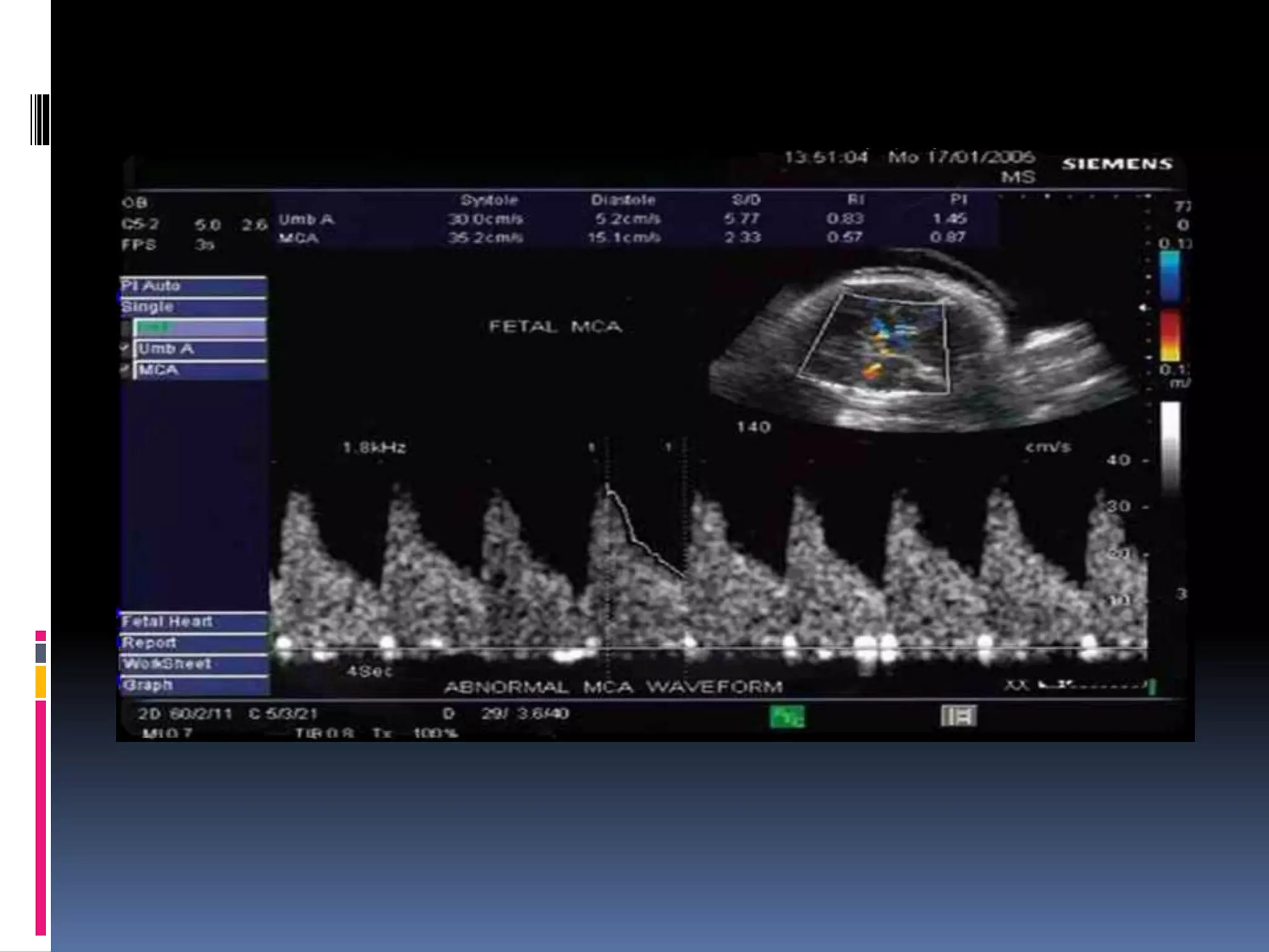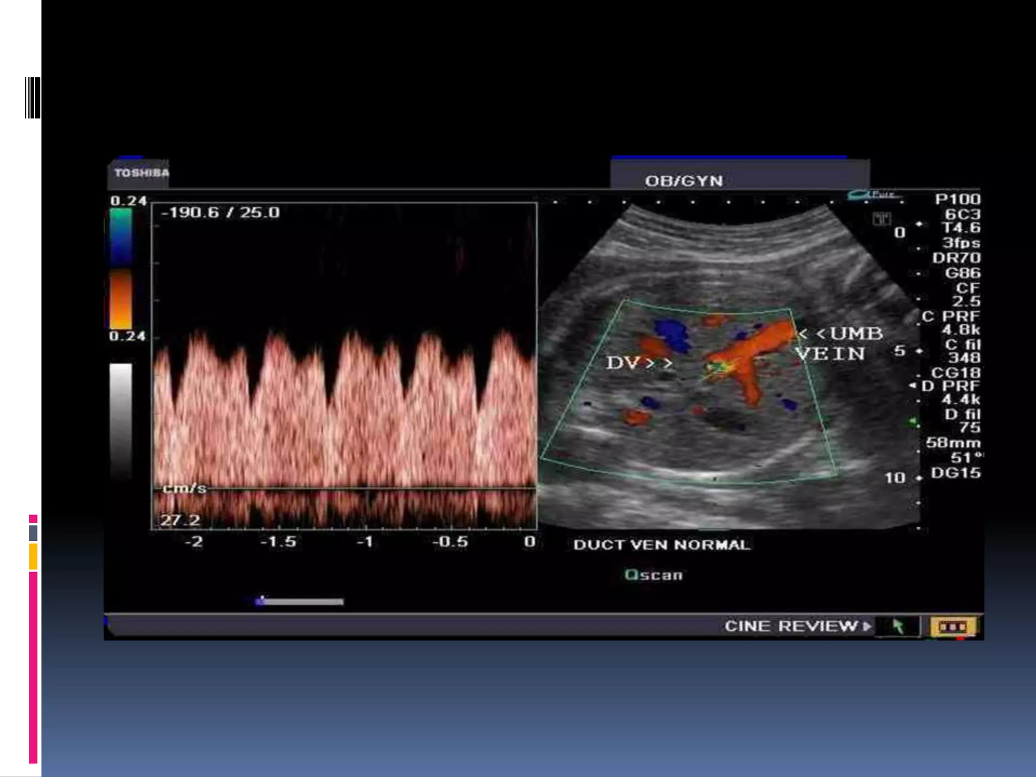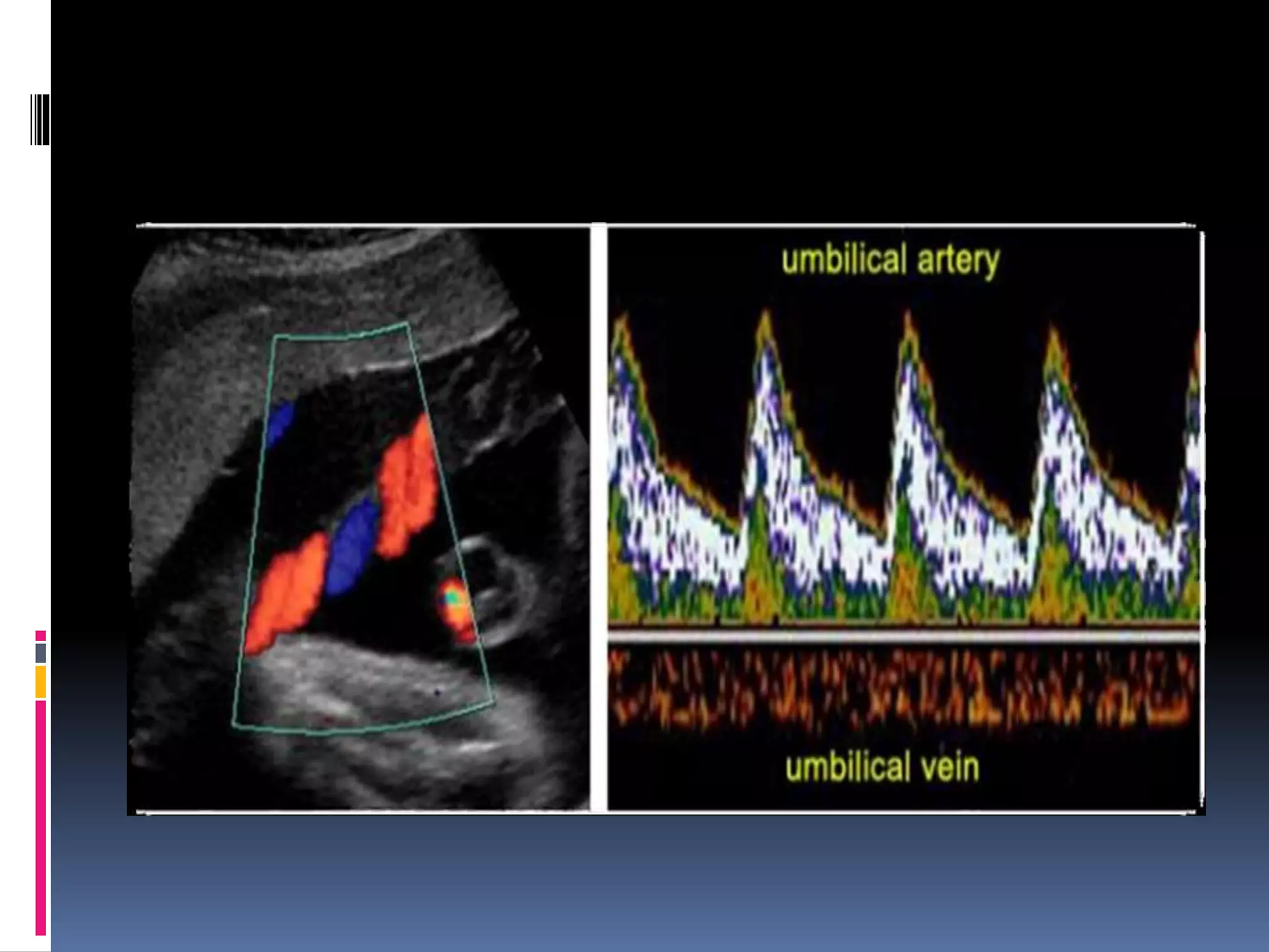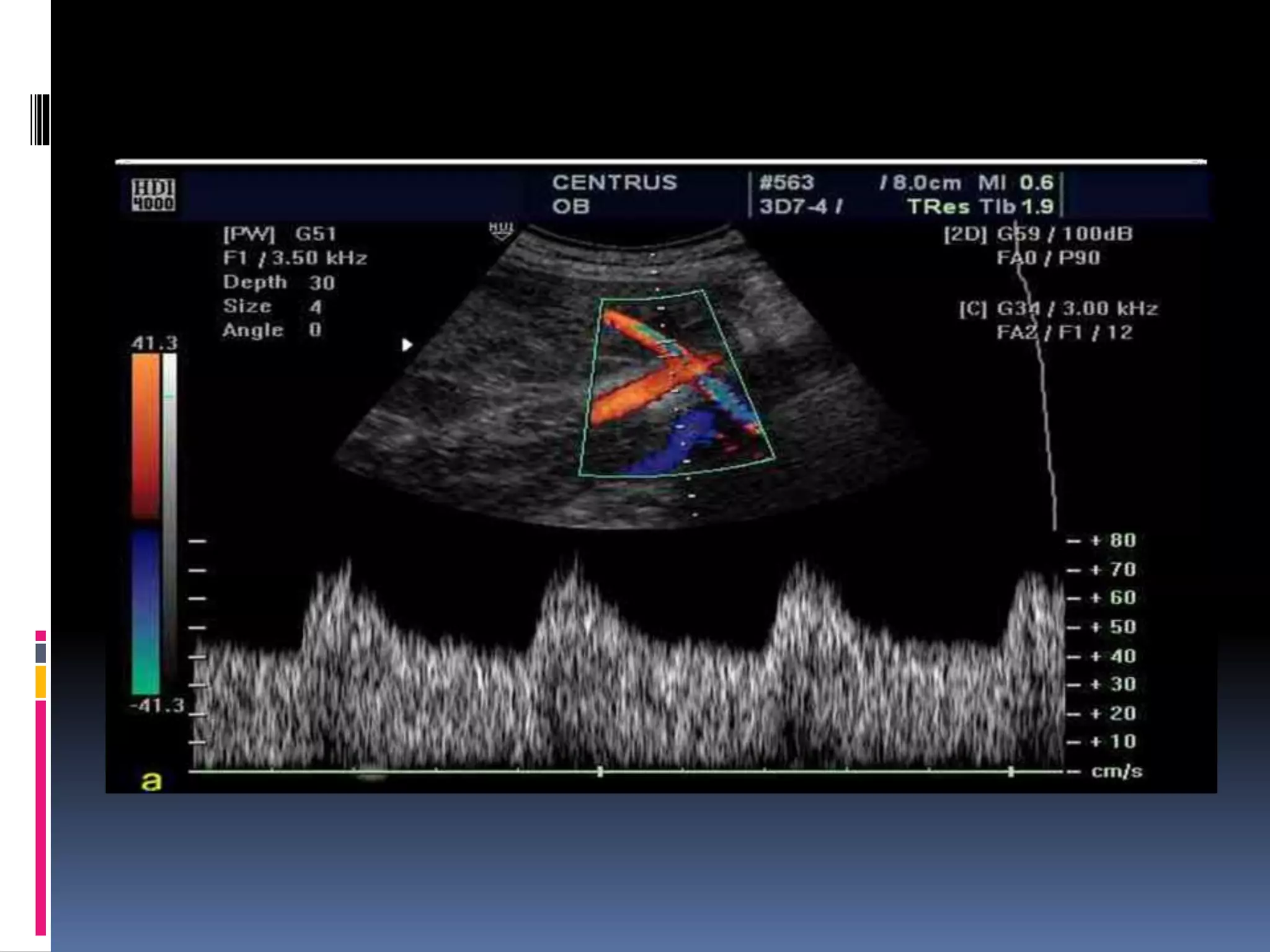 Doppler ultrasound is used in obstetrics to evaluate fetal growth and well-being. It assesses blood flow in the umbilical artery (placental circulation), middle cerebral artery (fetal circulation), and uterine arteries (maternal circulation). Abnormal Doppler readings include increased resistance and absent/reversed end diastolic flow in the umbilical artery, which indicate placental insufficiency and fetal growth restriction. The middle cerebral artery Doppler shows the brain-sparing effect in hypoxic fetuses. Together, Doppler ultrasound provides important information about the fetus's condition and helps time delivery.
