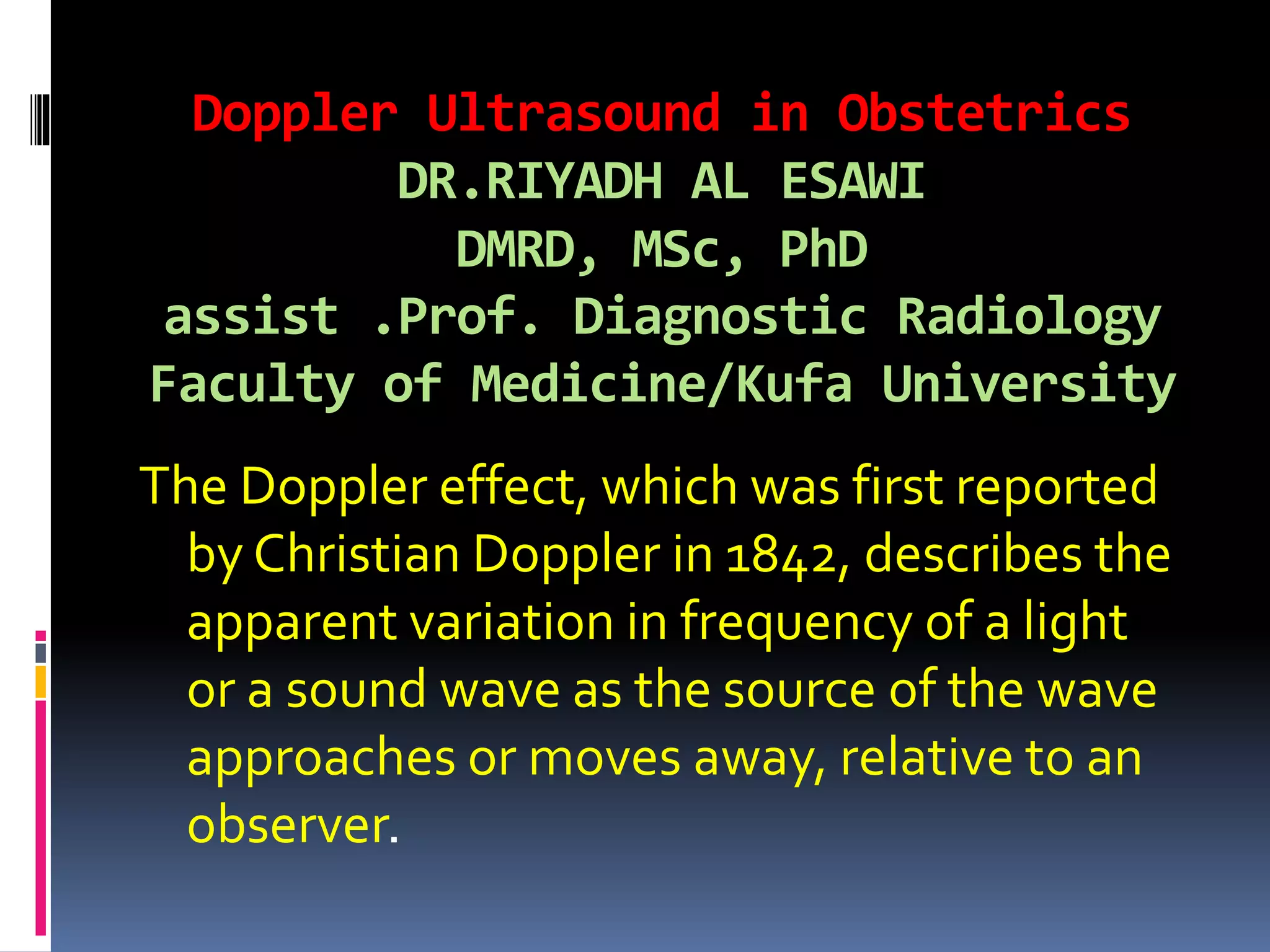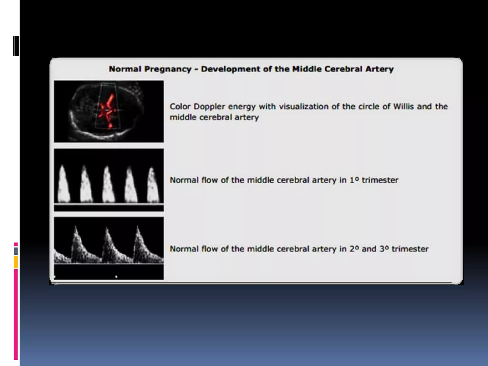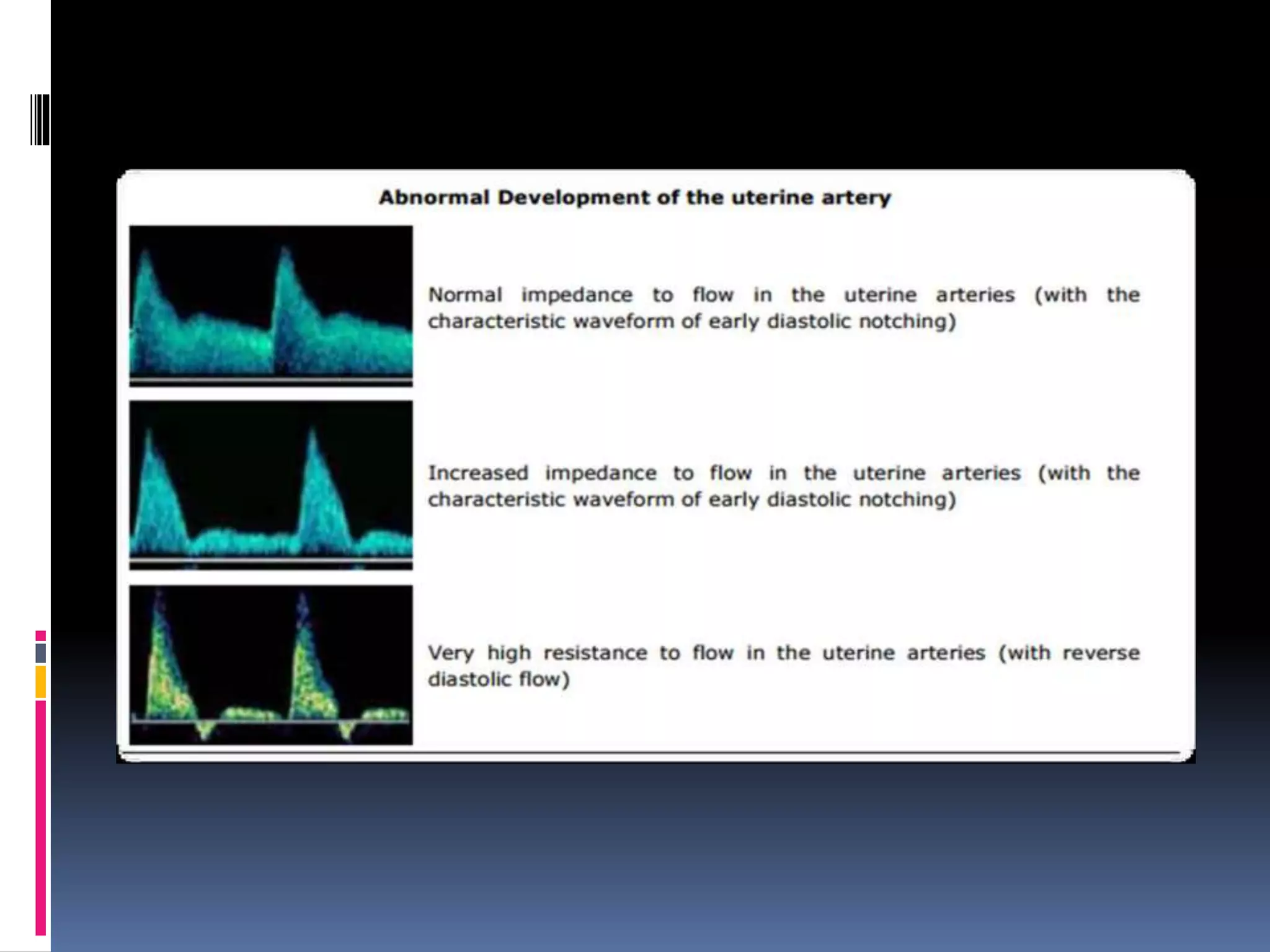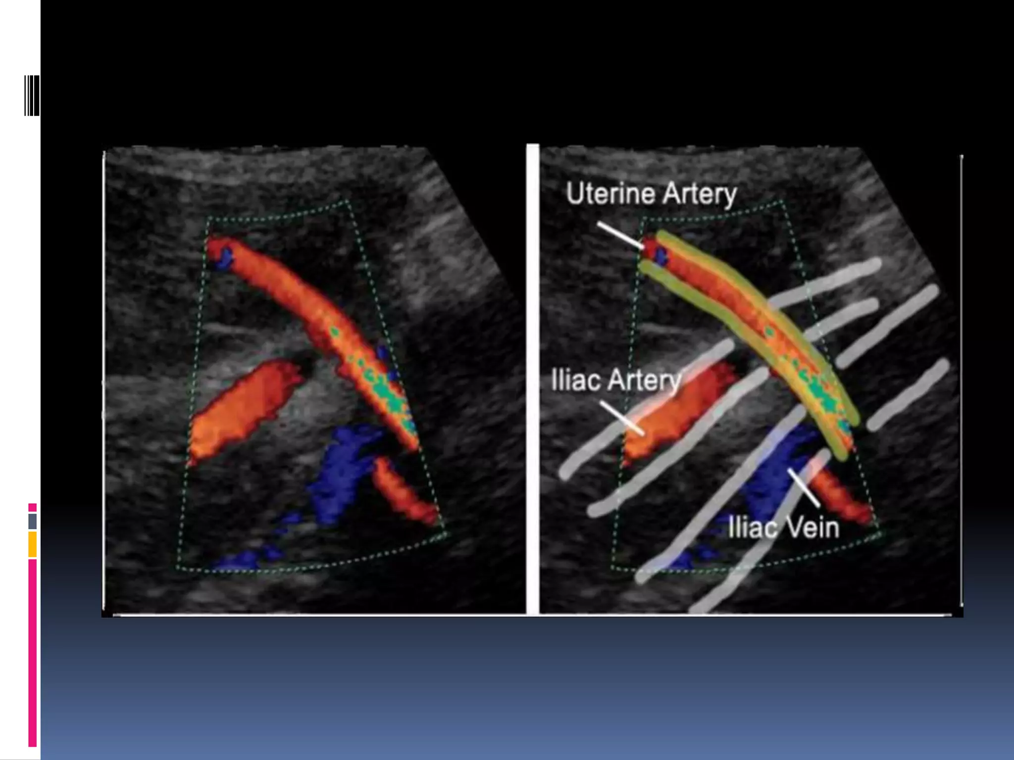 Doppler ultrasound is used in obstetrics to evaluate fetal growth and well-being. It assesses blood flow in the umbilical artery (placental circulation), middle cerebral artery (fetal circulation), and uterine arteries (maternal circulation). Abnormal Doppler readings include increased resistance and absent/reversed end diastolic flow in the umbilical artery, which indicate placental insufficiency and fetal growth restriction. The middle cerebral artery Doppler shows the brain-sparing effect in hypoxic fetuses. Together, Doppler ultrasound provides important information about the fetus's condition and helps time delivery.