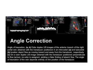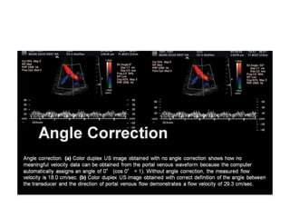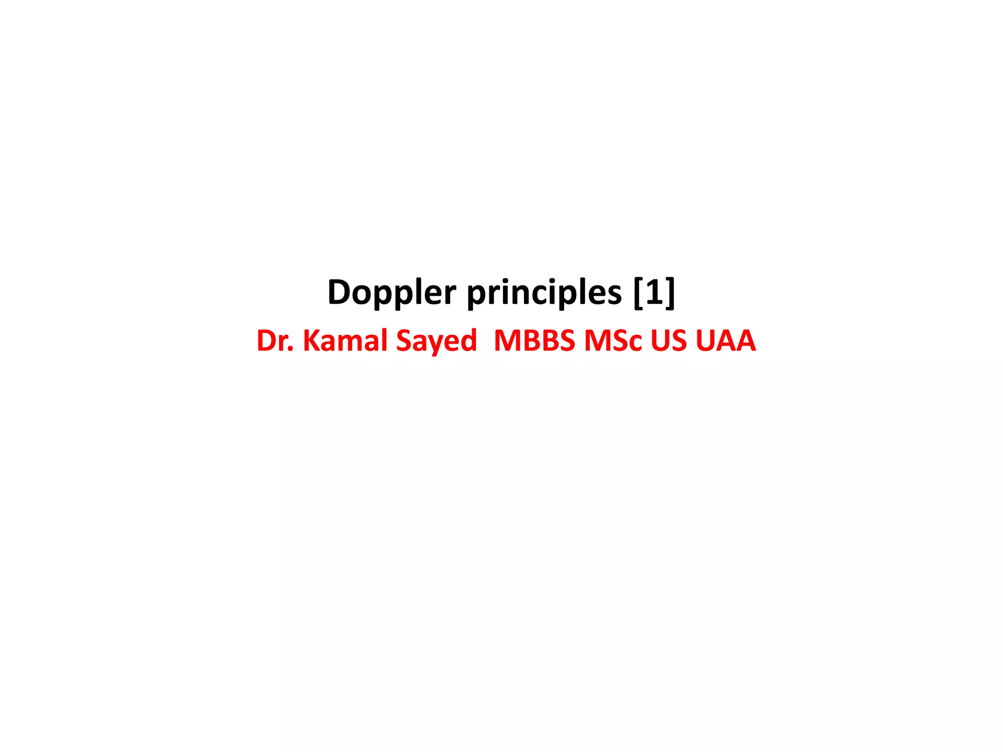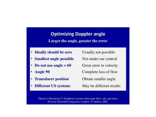 This document discusses Doppler ultrasound principles including the Doppler effect, spectral Doppler parameters, and optimizing Doppler measurements. The key points are: