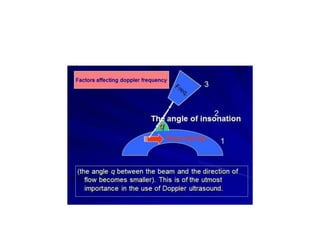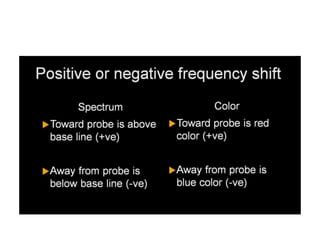 1) The Doppler effect is the change in frequency/pitch of a wave due to relative motion between the source and observer. This principle allows Doppler ultrasound to detect the direction and velocity of blood flow.