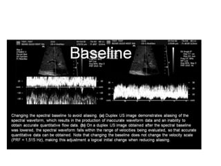2) Important spectral Doppler parameters that affect measurements include the baseline, Doppler angle, and velocity scale. The baseline and velocity scale must be optimized to prevent aliasing, while the Doppler angle should be corrected to compensate for inaccuracies introduced by non-parallel ultrasound beams.