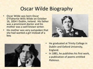 Oscar Wilde was an Irish writer known for his wit and flamboyant style. He wrote plays, poems, and one novel - The Picture of Dorian Gray. In the novel, a young man named Dorian Gray wishes to remain youthful while his portrait ages instead. Under the influence of Lord Henry, Dorian pursues pleasure and indulgence. As Dorian sins, his portrait reflects his corruption while he remains beautiful. The novel explores themes of aestheticism, morality, and the conflict between pleasure and virtue in Victorian society.