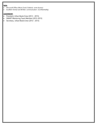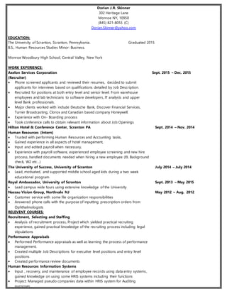 This document is a resume for Dorian J.R. Skinner. It lists his education, including graduating from The University of Scranton in 2015 with a B.S. in Human Resources Studies and a minor in Business. It also details his relevant work experience, including positions as a recruiter and intern in human resources. Finally, it outlines relevant coursework in areas like recruitment and staffing, performance appraisals, and human resources information systems.