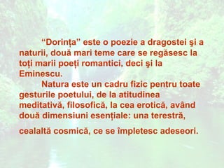 Poezia "Dorința" de Mihai Eminescu explorează teme precum dragostea și natura, cu un cadru meditat și erotic. Fiecare strofă evocă intensități emoționale și o comuniune profundă între om și natură, evidențiind aspirația iubirii în mijlocul peisajului natural. Textul se distinge prin structuri fonice armonioase și rime inedite, oferind un imn pentru frumusețea eternă a iubirii și naturii.
