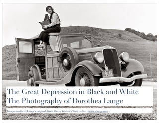Dorothea Lange documented the struggles of families impacted by the Great Depression through her photography. Her photos captured families living in poverty in camps, along roadsides, and on farms across the US. The photos show people of all ages and backgrounds struggling with unemployment, homelessness, hunger, and illness as a result of the economic hardship of the Depression era.