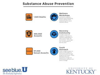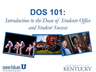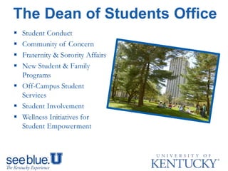 The document provides an overview of resources and important dates for new students and their families to help with the transition to college at the University of Kentucky. It discusses offices that provide student support services, orientation events in June, July and August like K Week, and encourages families to attend Family Weekend in October. Important deadlines are highlighted, such as completing online training by August 15th. Tips are provided for each month from June through December to help students adjust to college life and succeed academically.