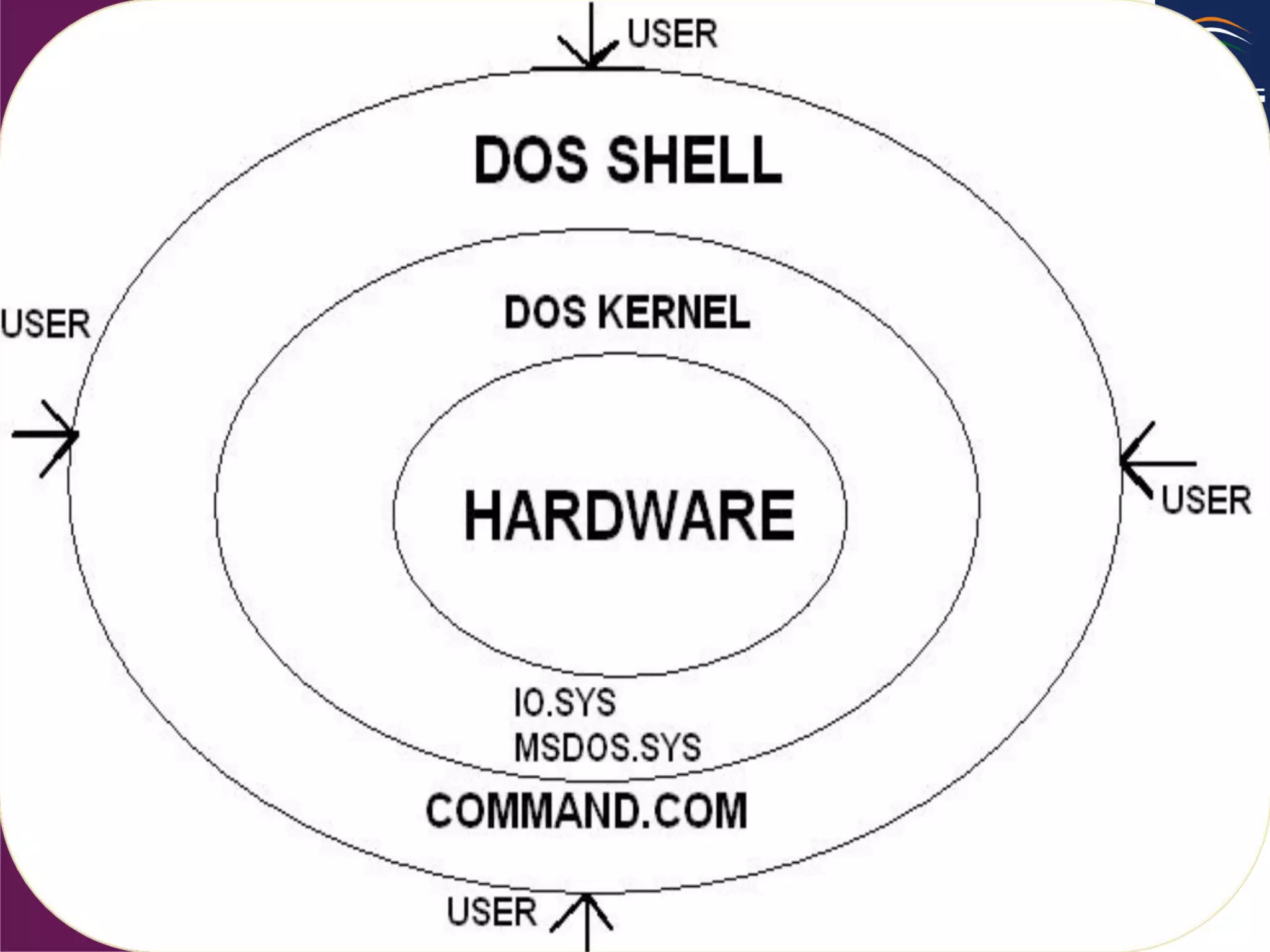 This document provides information about the Disk Operating System (DOS), including its three main layers: BIOS, the DOS kernel, and the command processor. It describes the functions of each layer, with BIOS managing hardware devices, the kernel providing file management, memory management and other core functions, and the command processor serving as the interface between the user and DOS through built-in commands. The document also lists and explains some common DOS commands.