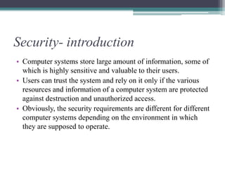 The document discusses computer security, outlining its necessity for protecting sensitive information and defining key goals such as secrecy, privacy, authenticity, and integrity. It categorizes threats into passive and active attacks, detailing methods like browsing, leaking, viruses, and logic bombs. It further covers cryptography, authentication, access control, and essential design principles for creating secure systems.