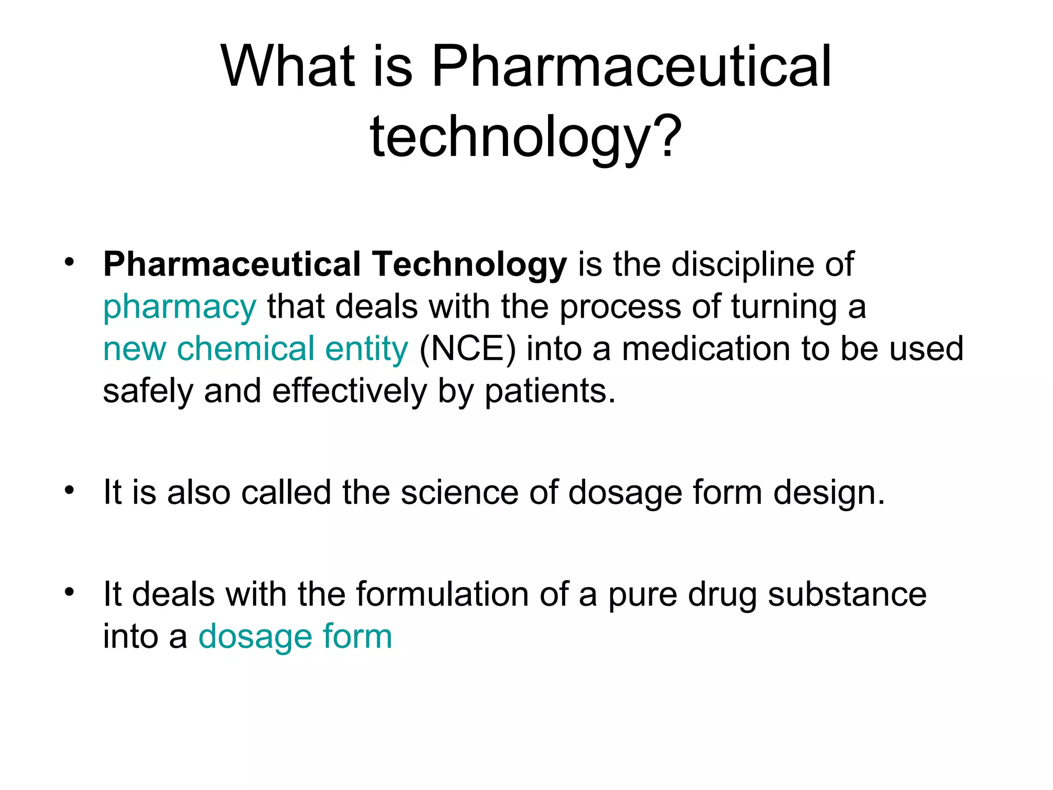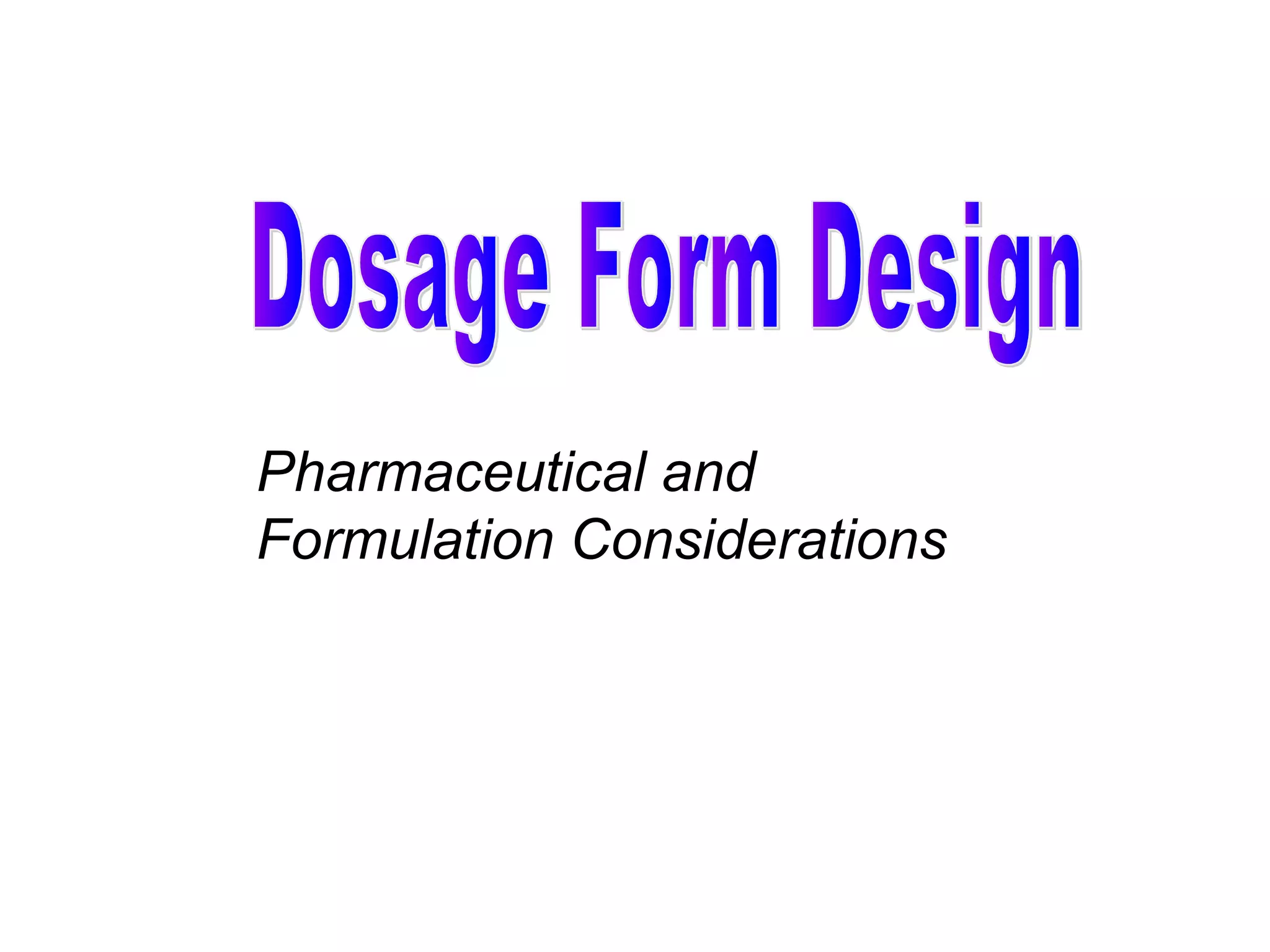 This document discusses pharmaceutical technology and considerations for developing drug dosage forms. Pharmaceutical technology deals with formulating new chemical entities into safe and effective medications for patients. Medicines contain drug substances formulated with excipients into dosage forms for delivery. Different dosage forms serve various purposes like protecting drugs, masking tastes, providing liquids or controlled release. Major considerations in designing dosage forms include physicochemical properties, biochemistry, and determining the optimal product type based on development goals. Therapeutic factors are also assessed like treatment type and patient attributes to select the appropriate dosage form.