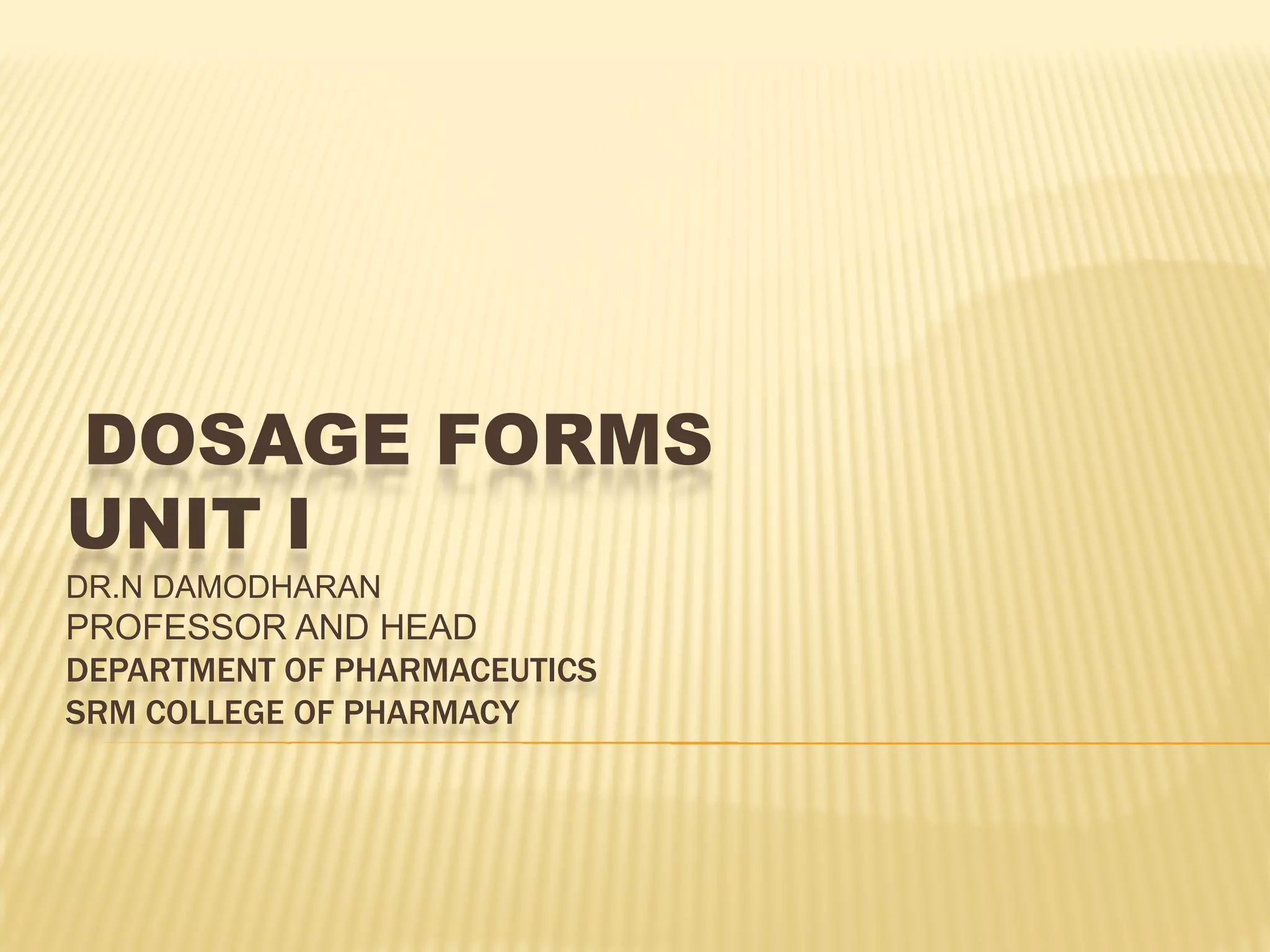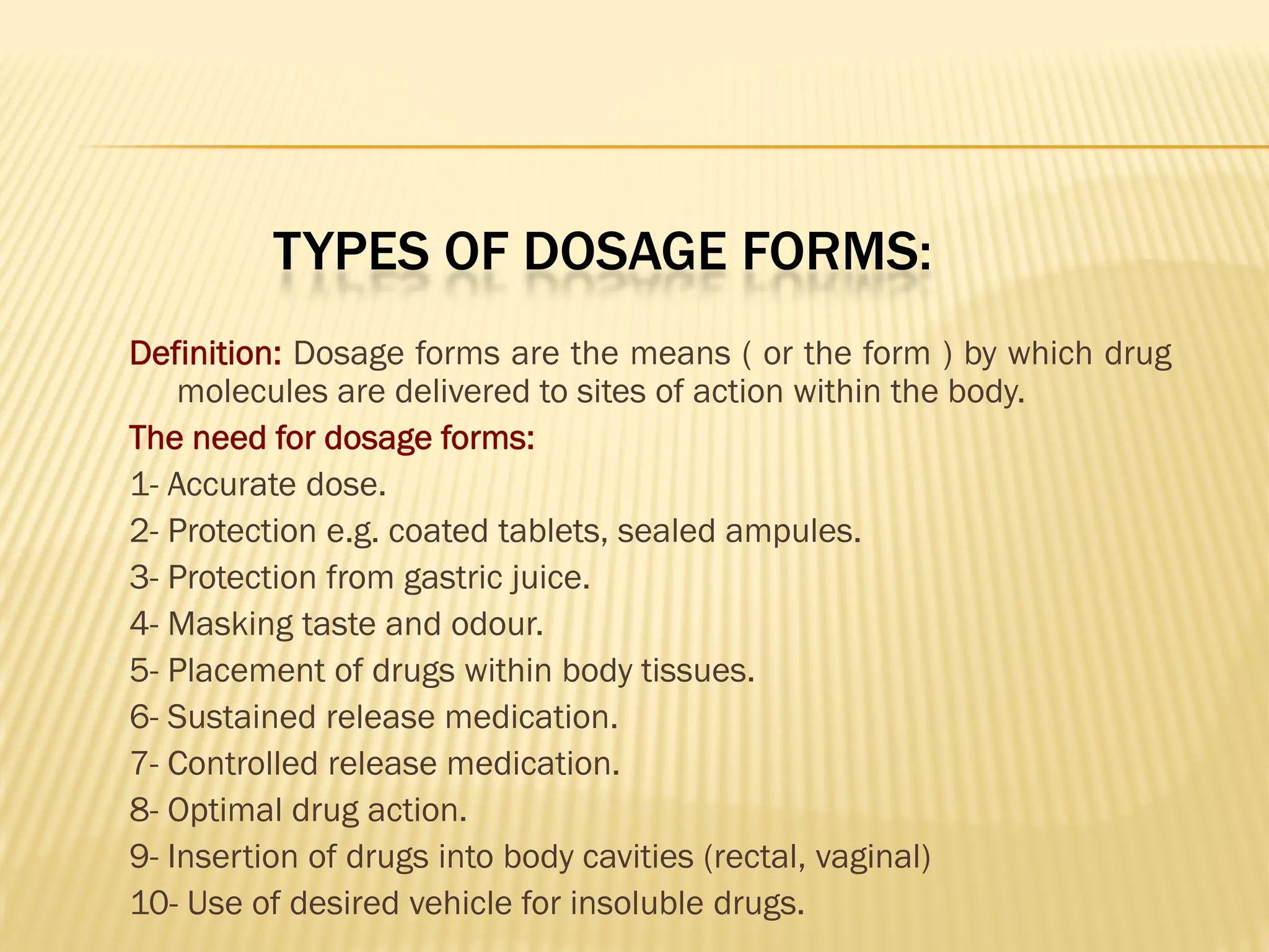 This document discusses various dosage forms used to deliver drug molecules to sites of action within the body. It defines dosage forms and describes their classification based on route of administration and physical form. Several oral dosage forms are described in detail, including tablets, capsules, liquids, and others. Topical, rectal, vaginal, parenteral, inhaled, and other dosage forms are also summarized. The purpose, composition, and examples of each type of dosage form are provided.