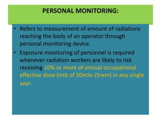 Personal dosimeters are used to measure the amount of radiation workers are exposed to. The three main types discussed are film badges, optically stimulated luminescent dosimeters, and thermoluminescent dosimeters. Film badges contain radiosensitive film that darkens with exposure. OSL dosimeters use aluminum oxide detectors that luminesce when struck by laser light, in proportion to exposure. TLDs contain lithium fluoride crystals that absorb radiation and emit light through thermoluminescence, allowing measurement of exposure. Dosimeters should be worn at collar level outside protective equipment to monitor head exposure.