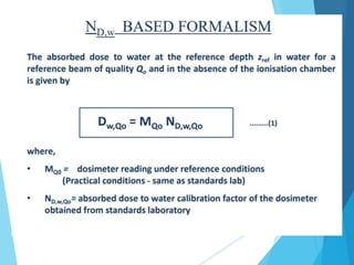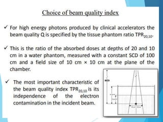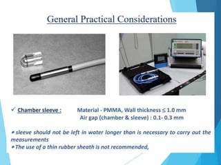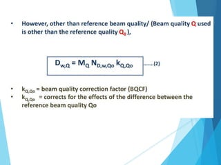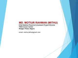 MD. Motiur Rahman is the Chief Medical Physicist and Assistant Project Director at TMSS Cancer Center in Bogura, Bangladesh. The document discusses the history and importance of radiation dosimetry in cancer treatment. It describes how radiation dose is measured using instruments like ionization chambers placed in the radiation beam. Dose measurements must be standardized according to dosimetry protocols to ensure cancer patients receive the prescribed radiation amounts accurately. Absolute and relative dosimetry methods are outlined as well as factors like accuracy, precision, and uncertainty which are important for high quality dose measurements.