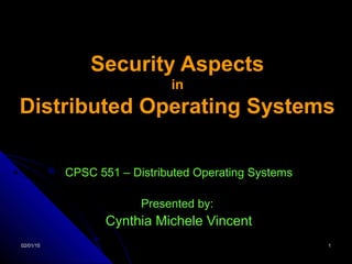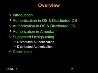 This document discusses security aspects in distributed operating systems. It covers authentication methods like symmetric cryptography and public key cryptography. It also discusses authorization mechanisms like access control matrices, lists and capabilities. The document proposes a design for distributed authentication using public key Kerberos and distributed authorization using trust management systems. It concludes that current security in distributed OS still relies on traditional centralized mechanisms and that alternatives like trust management systems are still immature.