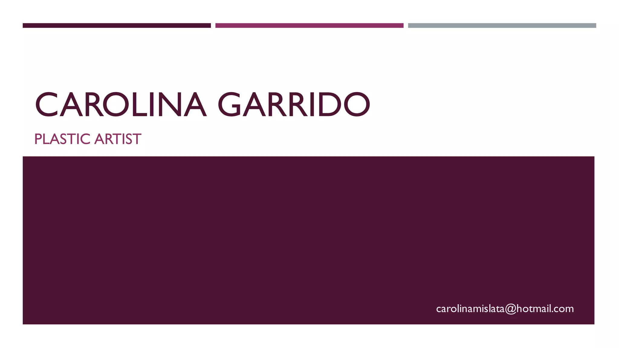 Carolina Garrido is a plastic artist from Valencia, born in 1995, who has explored various artistic mediums including oil painting, watercolor, and monochromatic projects. Her works focus on experimenting with materials and composition, aiming to integrate art with fashion. The document details her biography, artwork categories, and curriculum, showcasing her evolution in the field of fine arts.