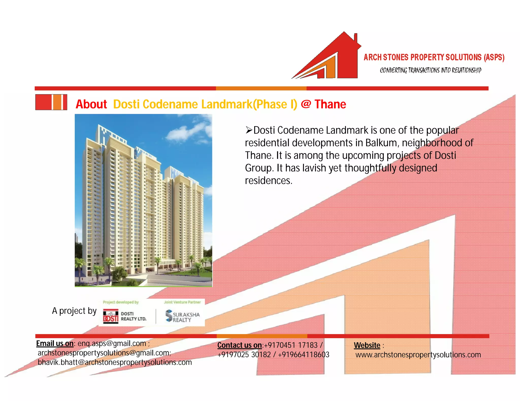 Dosti Codename Landmark is an upcoming residential development project in Balkum, Thane by Dosti Group. It will have lavishly designed homes. The document provides details about the project such as contact information, master layout plans, amenities including a swimming pool and clubhouse, typical flat plans for 2BHK units, and location maps. It also gives an overview of Dosti Group, the developer, as being in the real estate business for over 20 years focusing on establishing relationships and providing quality homes.