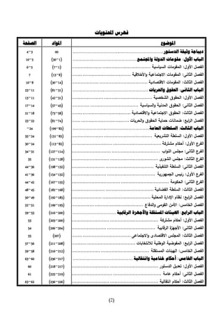 تشمل الوثيقة مشروع دستور جمهورية مصر العربية الجديد، الذي يحدد مبادئ وأسس الدولة والمجتمع، بما في ذلك حقوق المواطنين وواجباتهم. يؤكد الدستور على أن الشعب هو مصدر السلطات وأن السيادة للقانون، مع التأكيد على مبدأ المساواة والعدالة الاجتماعية. كما يتضمن تناولًا لمقومات الدولة السياسية والاجتماعية والاقتصادية وأهمية الوحدة الوطنية.