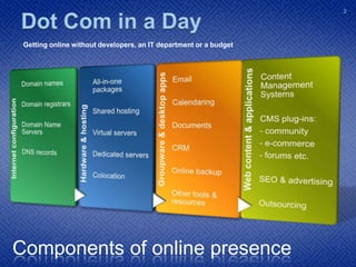 The document provides guidance on establishing an online presence without relying on developers or a large budget, emphasizing the use of free and open-source software. It outlines essential components such as domain registration, hosting options, and various tools available for non-technical users, alongside advice on selecting suitable services. Key topics include email, calendaring, CRM, and content management systems that can facilitate online operations for businesses and organizations.