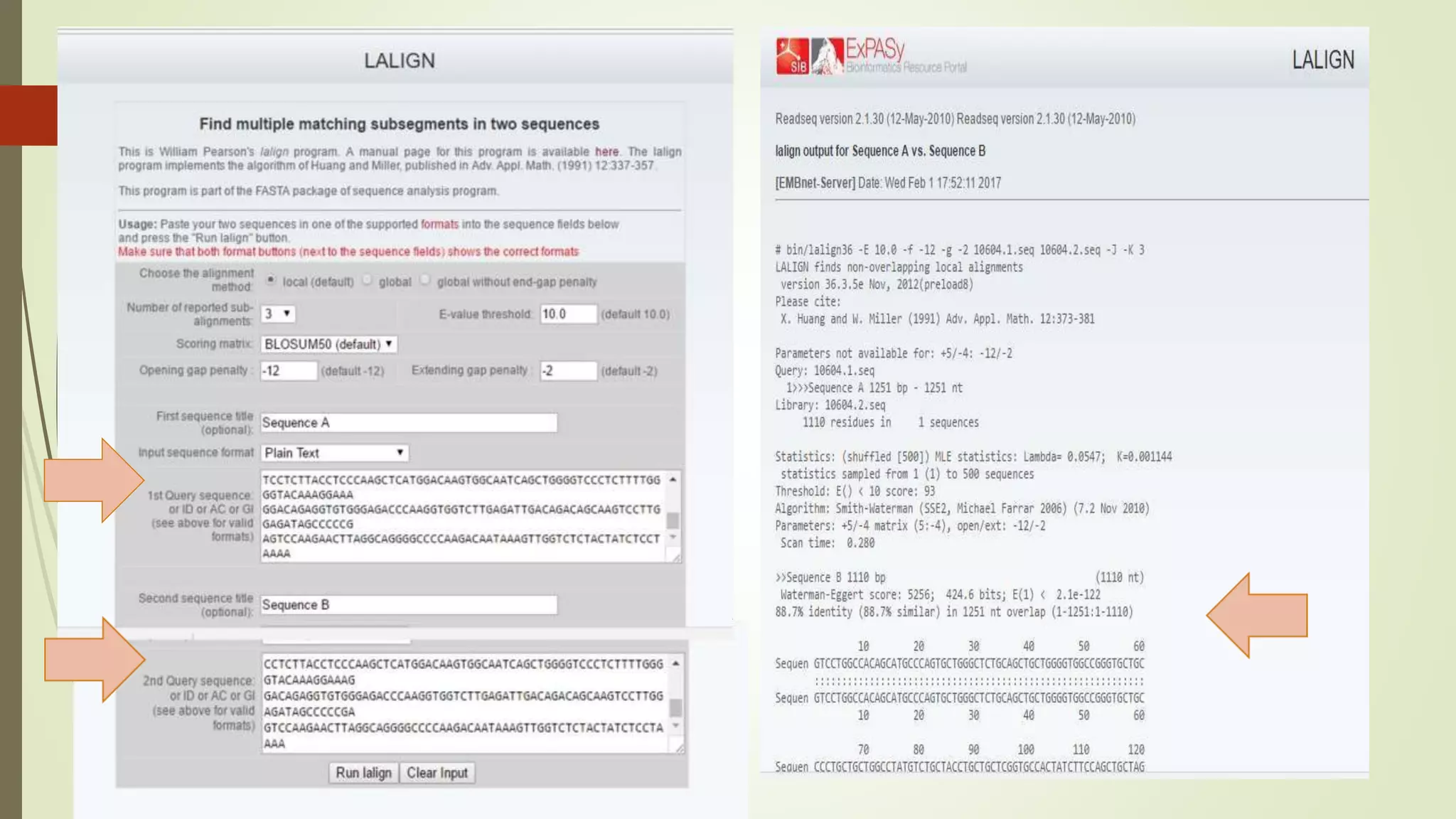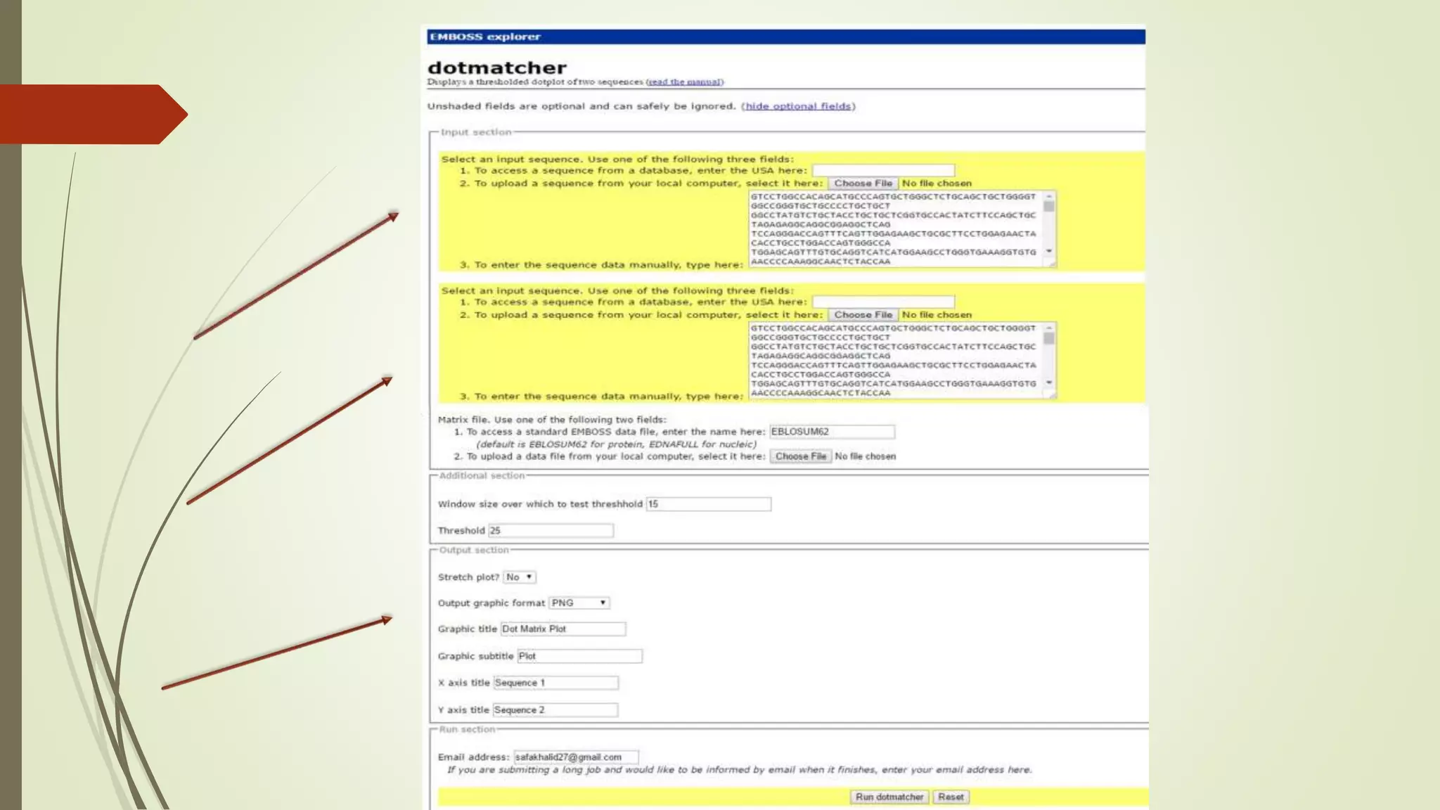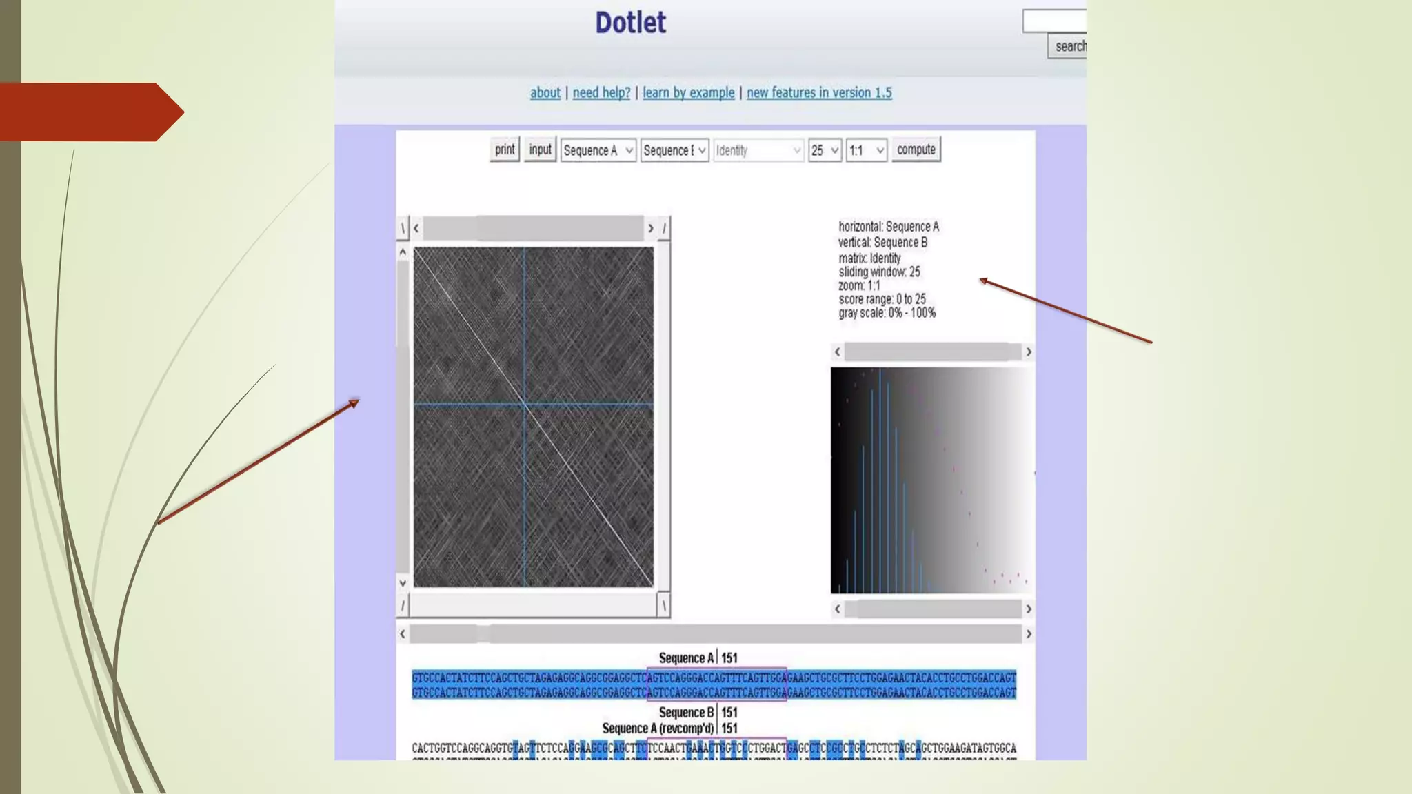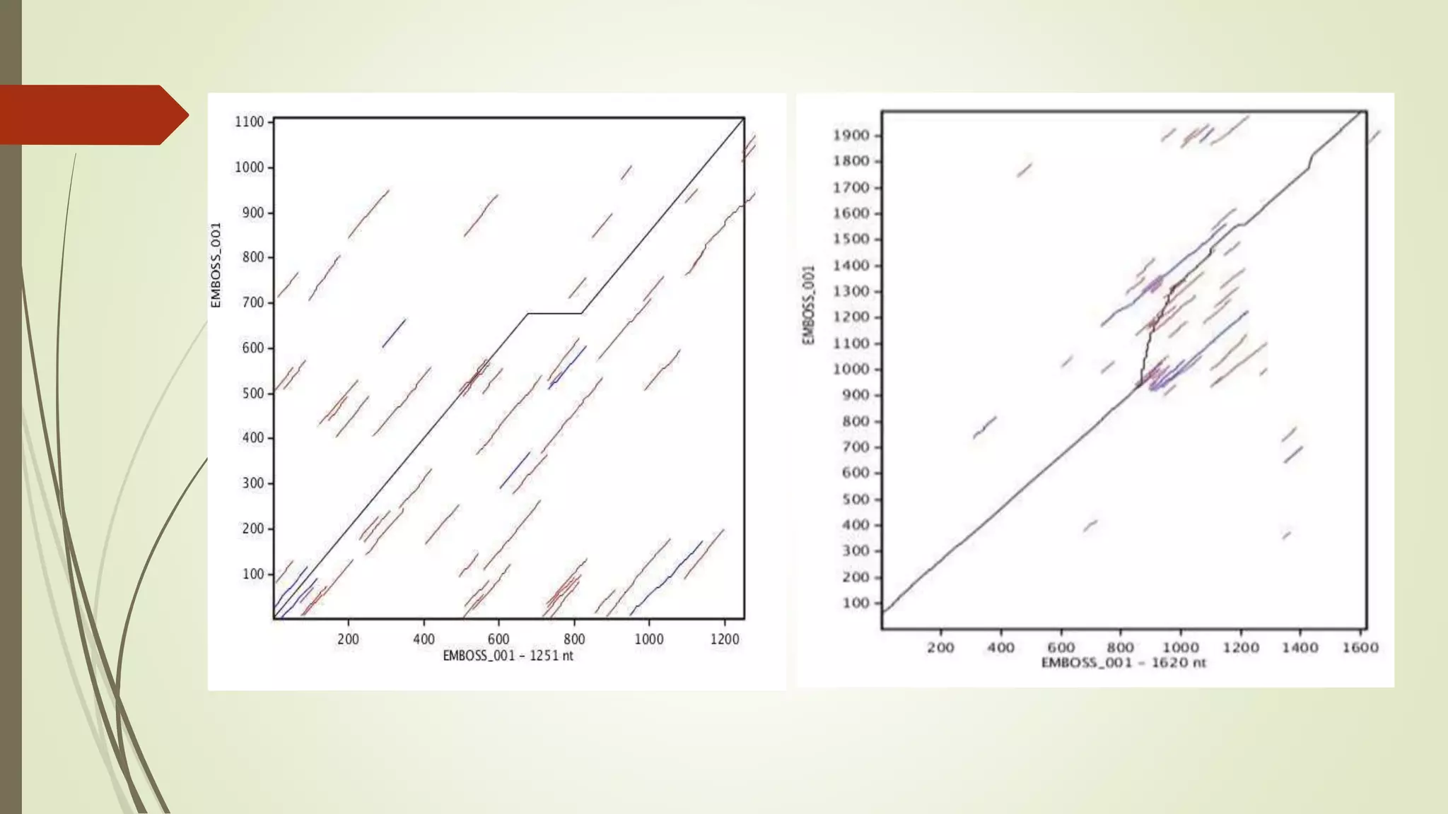 Sequence alignment involves arranging DNA, RNA, or protein sequences to identify similar regions and infer functional or evolutionary relationships. Dot matrix alignment visually represents the similarities between two sequences in a grid, where dots indicate matching characters. Software like LALIGN, DOTLET, and DOTMATCHER can perform dot matrix alignments, calculating scores based on factors like gap penalties to identify significant matches despite differences. Dot plots can reveal similarities like inverted repeats or palindromic sequences.