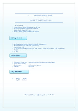 Hasnaa Ahmad AbdulHady is a software engineer seeking a challenging position within a global organization. She has experience developing Windows applications using Visual C# .NET and Microsoft Visual C# .NET for web applications. Some of her past roles include working as a Dot Net Developer at IT Works company where she built websites using HTML, CSS, ASP.NET, JavaScript and connected websites to databases using SQL. She also led a graduation project on web accessibility for the deaf at Mansoura University where she built websites using technologies like HTML, ASP.NET, JavaScript, and connected them to databases using SQL.