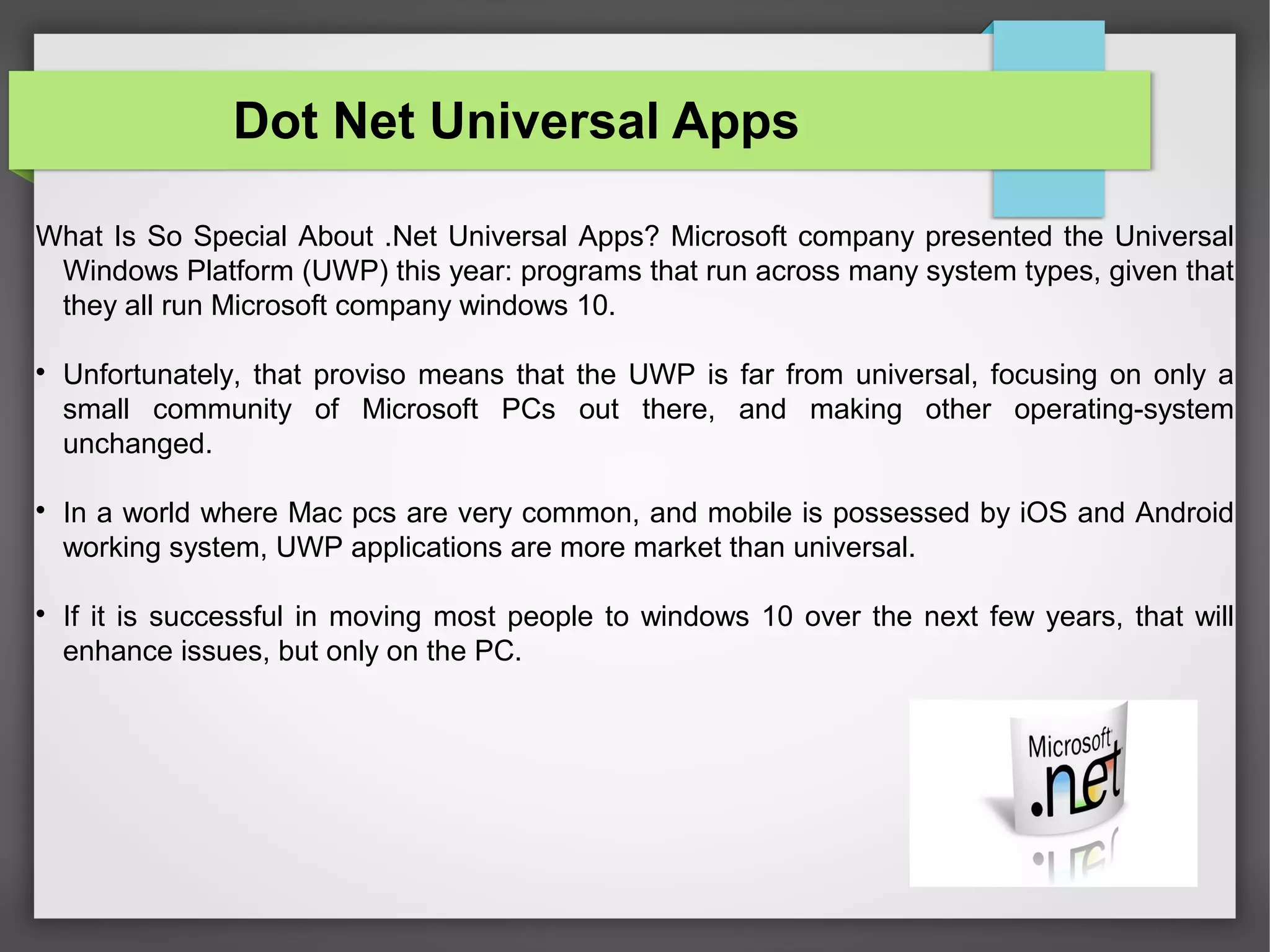 The document discusses Microsoft's Universal Windows Platform (UWP) and its limitations in truly being universal, as it primarily supports Windows 10 devices while lacking broader compatibility with other operating systems like iOS and Android. It highlights challenges developers face in creating cross-platform applications using .NET languages and mentions third-party tools like Xamarin that facilitate some cross-platform development, albeit with certain drawbacks. UWP applications benefit from features like .NET Core, enhanced performance through .NET Native, and easier distribution via the Windows Store.