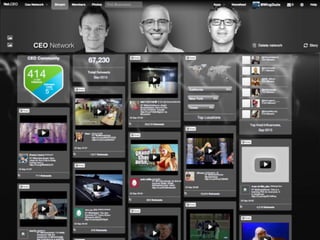 The document describes dotCEO, a social network for chief executives and other high-level business professionals. DotCEO provides members with a custom web address based on their name and positions them as an exclusive online community. The network aims to grow virally by providing domains to influencers who can then invite their contacts to join with their own domain, continuing the chain reaction of invites and signups.