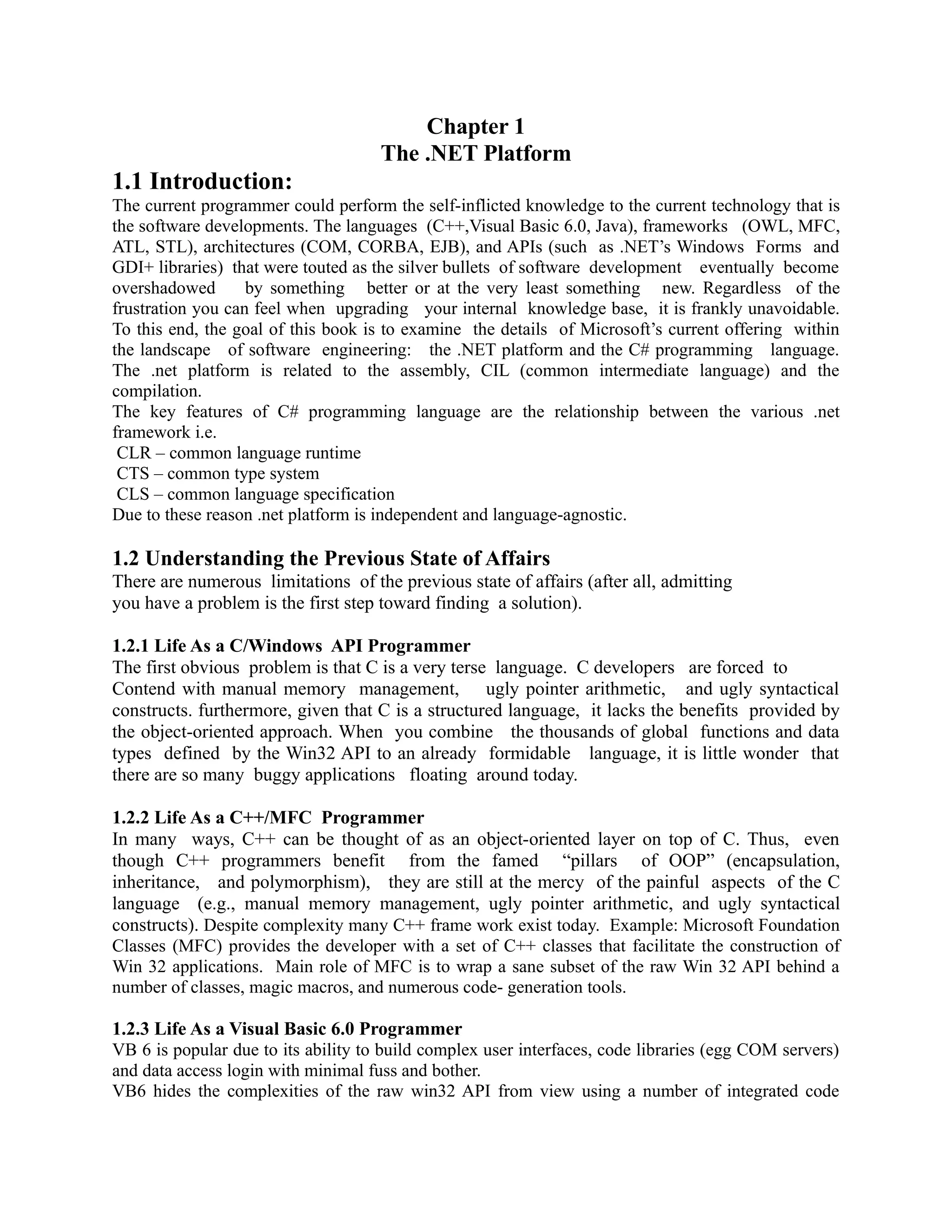 This document provides an overview of the .NET platform and C# programming language. It discusses the limitations of previous programming models such as C/Windows API, C++/MFC, Visual Basic 6.0, Java/J2EE, and COM. It then introduces the key components of the .NET platform including the CLR, CTS, and CLS which address these limitations and provide language independence and interoperability. The document also summarizes features of the C# programming language and how it has evolved with new .NET releases.