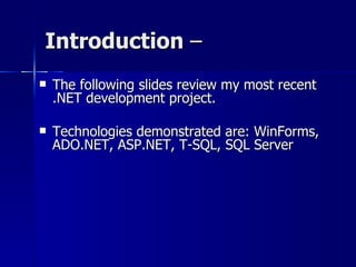 The document summarizes a .NET development project that demonstrated various technologies including WinForms, ADO.NET, ASP.NET, T-SQL, and SQL Server. It used an n-tier architecture with separate tiers for the user interface, business logic, data access, and stored procedures. Business rules were encapsulated and validated. Data access was stateless through ADO.NET. Stored procedures were used for database access and code reusability. XML was used to populate datasets and configure the application. JavaScript created a tabbed interface.