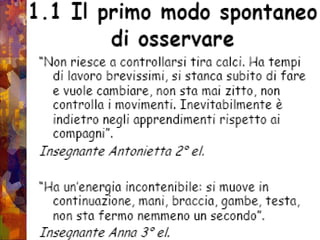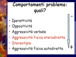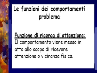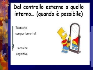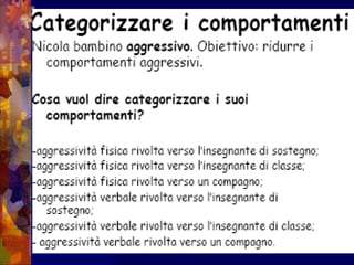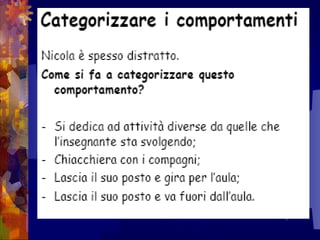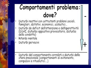 Il documento analizza i disturbi del comportamento scolastico, in particolare quelli legati al deficit di attenzione/iperattività (DDAI), evidenziando i deficit cognitivi e comportamentali degli alunni. Vengono proposte strategie di intervento multimodale che comprendono terapie farmacologiche e psicologiche, insieme a misure educative per gestire i comportamenti problematici. Si sottolinea l'importanza di un ambiente scolastico facilitante e di un approccio metacognitivo per supportare il potenziale di apprendimento degli alunni con DDAI.