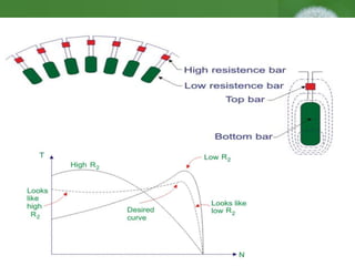 This document discusses the double cage induction motor. It aims to achieve high starting torque without affecting efficiency. This is done by using a rotor with two cages made of different materials - an outer cage of high resistivity material and an inner cage of low resistance material like copper. At start up, most current flows through the high resistance outer cage, providing high starting torque. During normal operation, current mostly flows through the low resistance inner cage, maintaining high efficiency. Some key applications mentioned are water pumps and machines like lathes and drills that require high starting torque.