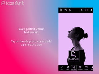 This 3 sentence summary provides the key steps for creating a double exposure photo using PicsArt: