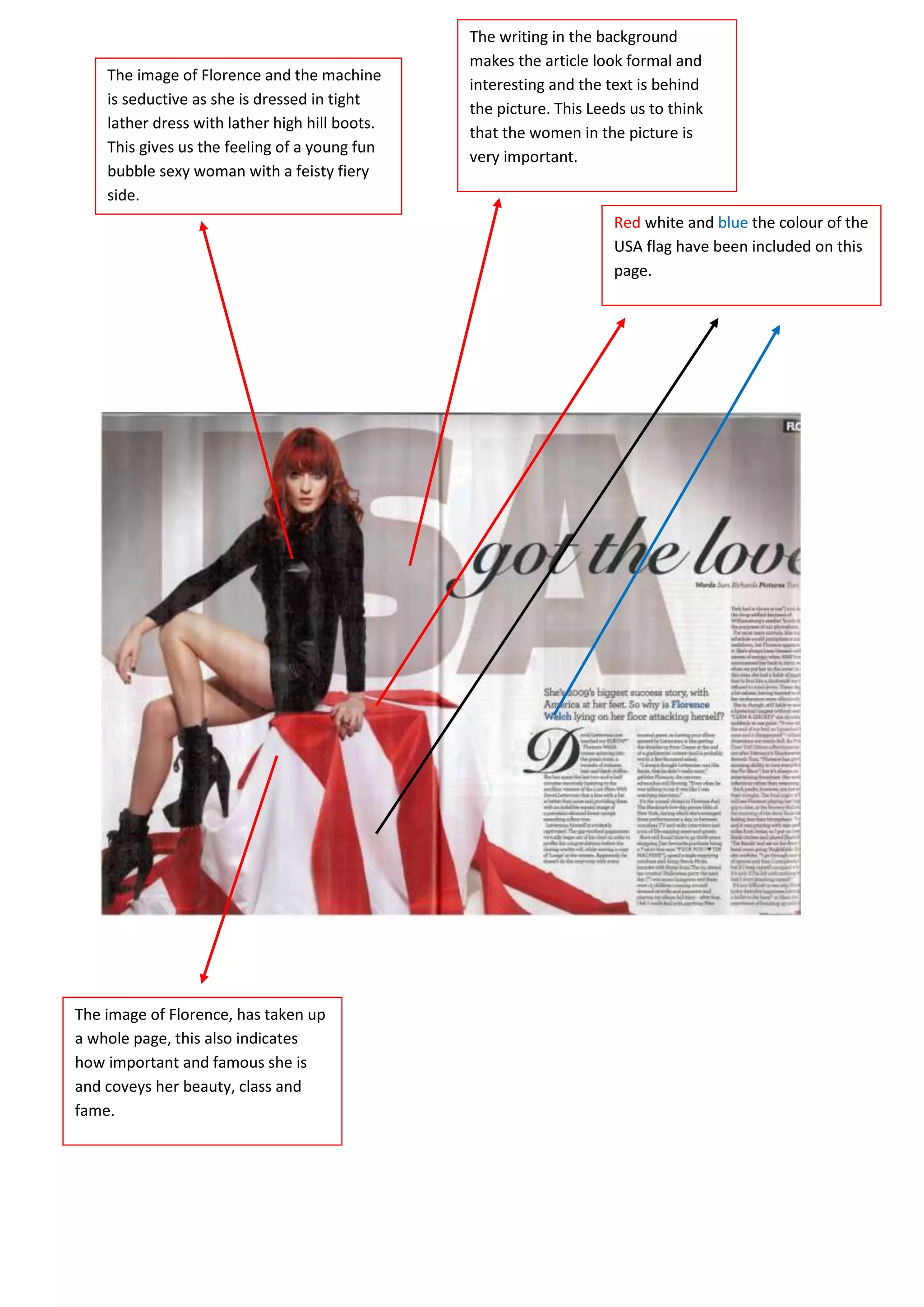 The document describes an image of Florence and the Machine that appears formal and interesting due to text behind the picture. The tight leather dress and high heel boots suggest a young, fun, sexy woman with a fiery side. Red, white, and blue colors of the US flag are also included on the page.