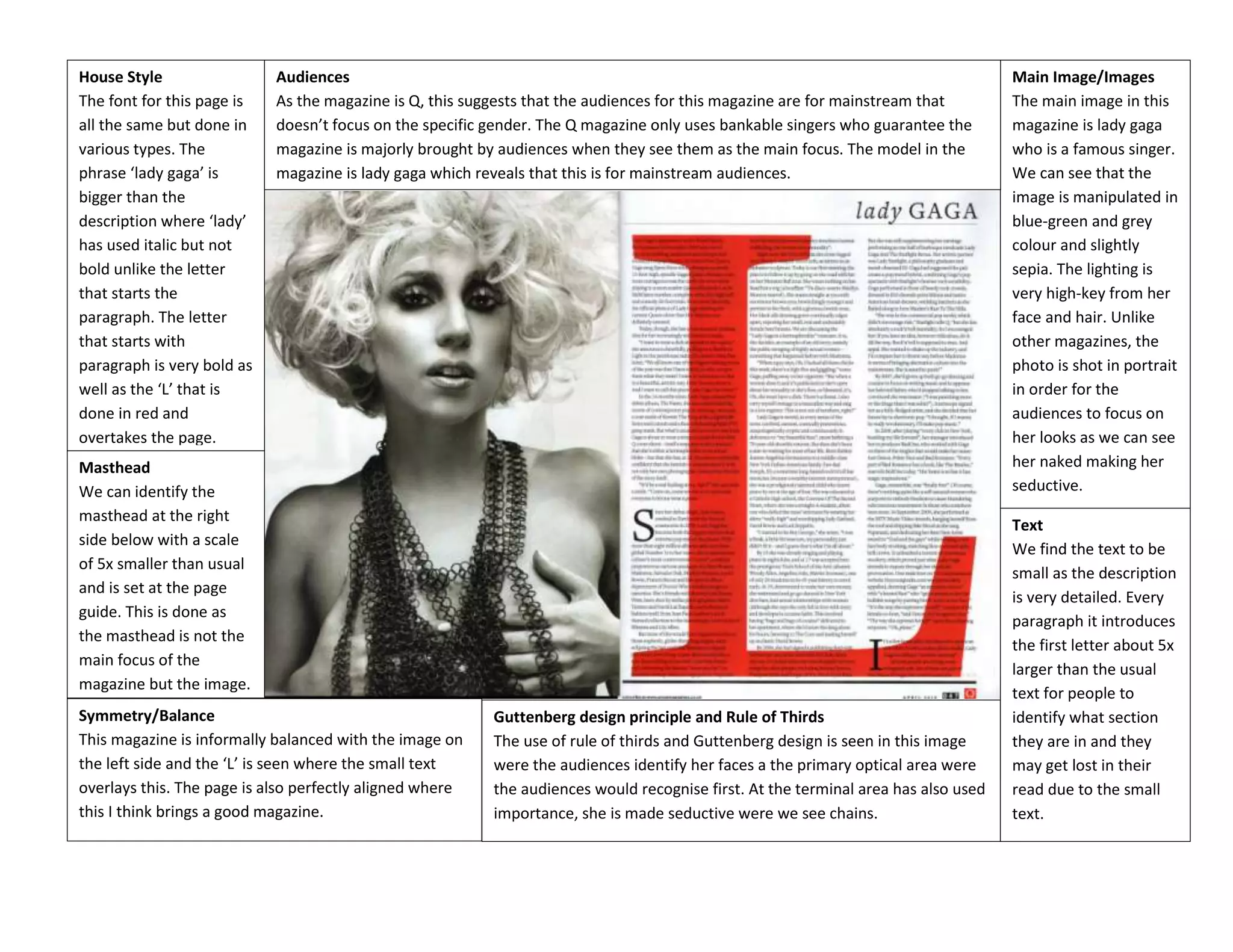 This document analyzes the design elements of 4 magazine pages, including their house style, audiences, mastheads, symmetry/balance, use of design principles, main images, and text. The magazines analyzed are Q Magazine, NME Magazine, and Kerrang Magazine. Key details summarized include that Q Magazine targets mainstream audiences, NME targets students, and Kerrang targets a rock music niche audience interested in bands like My Chemical Romance.