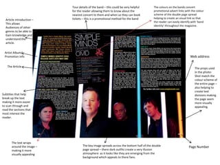 This document summarizes a magazine article spread about Lady Gaga. The spread features a large half-page image of Lady Gaga, naked but covered in chains, conveying confidence, sexuality, and a resistance to conforming to social norms. The text is broken into columns and sections marked by large red letters. Additional details include tour dates to promote ticket sales and matching colors between the article text and images to create a cohesive and visually appealing design.