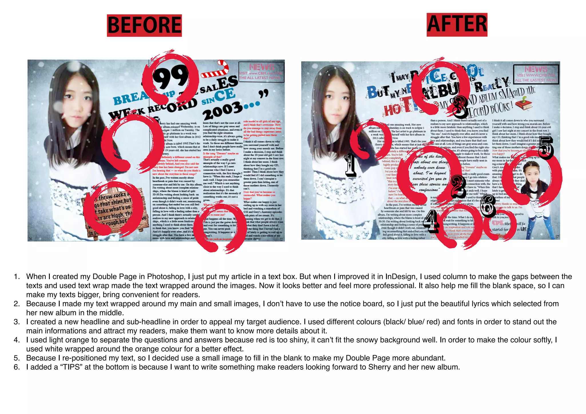 1. The document discusses improvements made to a double page layout in InDesign compared to an earlier Photoshop version. Using columns and text wrap allowed the text to flow better around images, filling blank space and making the page feel more professional.
